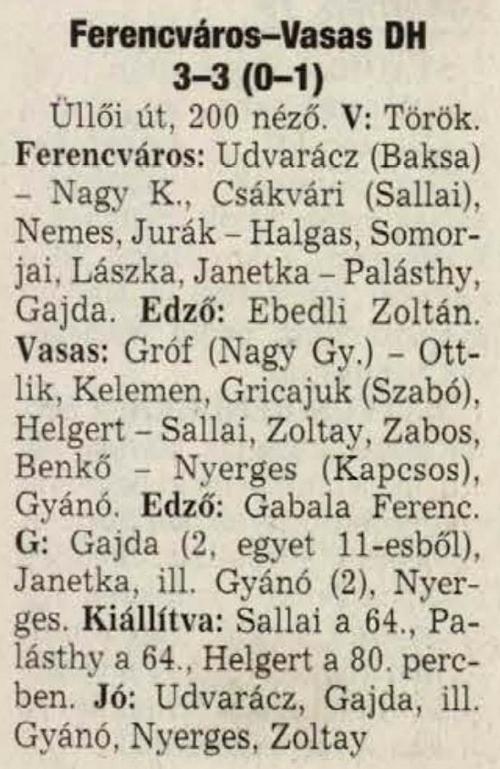 Vasas: Végh – Juhár – Mónos, Tóth A., László – Herczeg (Szilveszter 46.), Zováth, Galaschek, Aranyos (Tíber 83.) – Kabát, Sowunmi