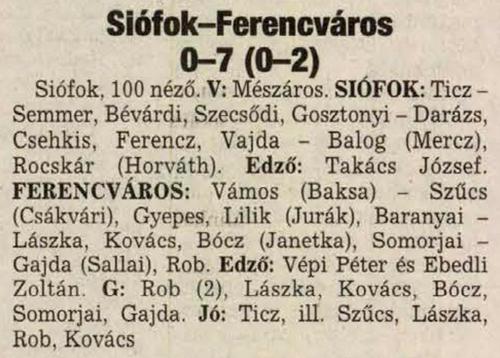 Siófok: Bíró – Soós, Bimbó, Juhász – Sánta (Sallai 45.), Grósz, Babos, Hanák, Bédi (Zabundu 63.) – Kulcsár (Földes I. 67.), Földes G.