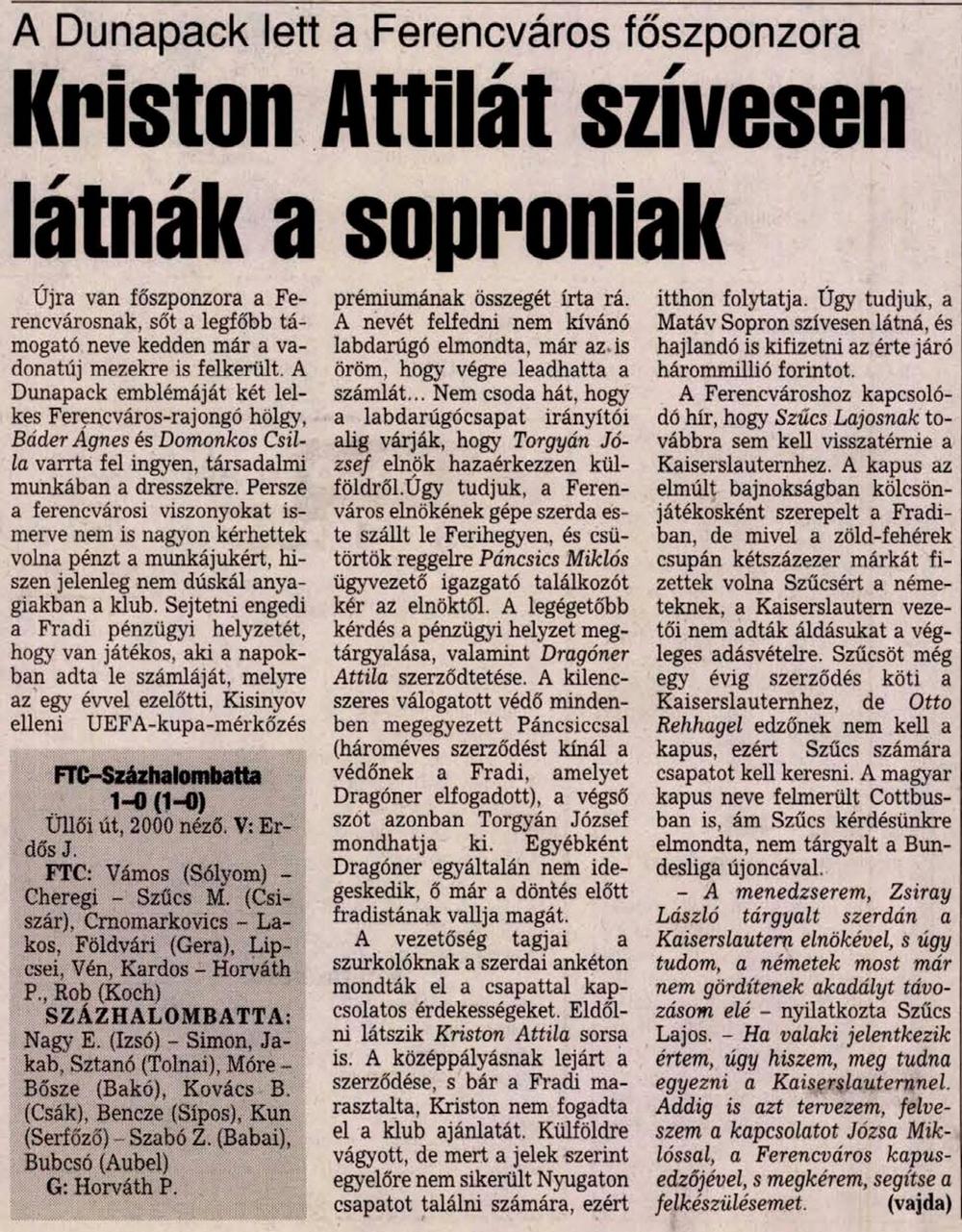 2000.VII.12. Ferencváros – Százhalombatta 1-0 (edzőmérkőzés)