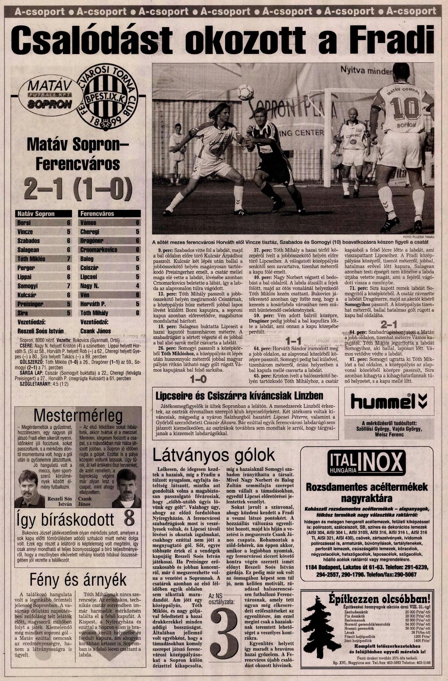 66. perc: a Sopron kapuja előtt hatalmas kavarodás alakult ki, melynek végén Tóth Mihály ballal nagy kapufát lőtt, a visszapattanóból Lipcsei találta telibe Salageant.