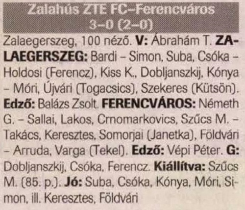 ZTE: Turi – Kocsárdi, Telek, Udvari, Filó – Babati, Nagy L. (Dobrjanszkij 69.), Balog Cs., Róth – Waltner, Egressy (Sabo 80.)