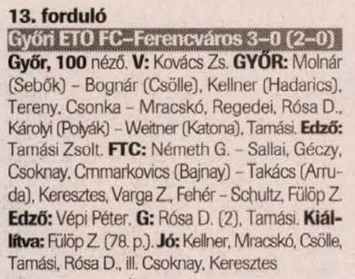 Győri ETO: Posza – Böjte, Stark, Bajusz, Vasas – Baumgartner (Nagy L. 84.), Győri, Szanyó, Farkas – Kenesei (Balla 78.), Vayer