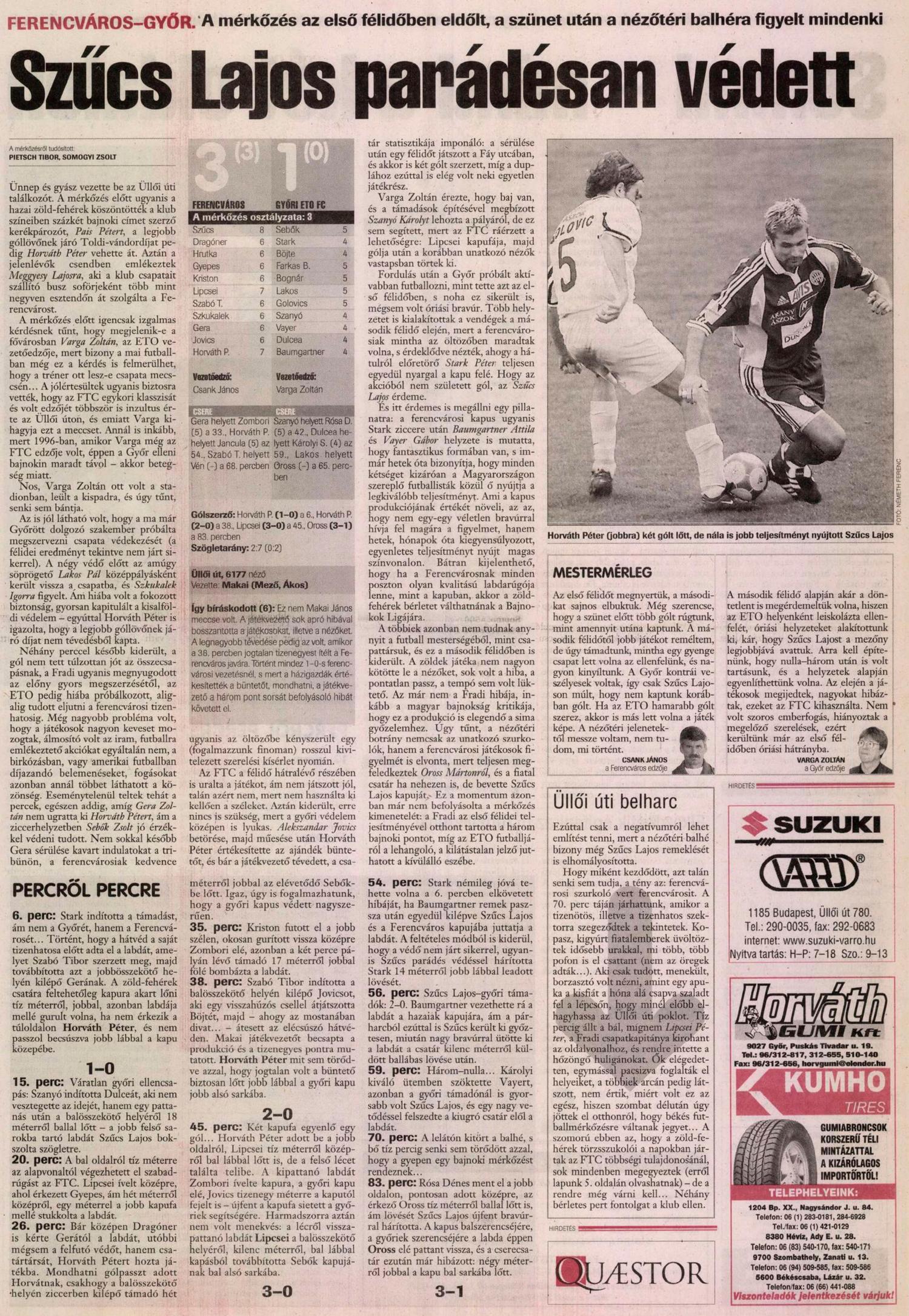 Horváth Péter az elmúlt héten két góllal járult hozzá a Vasas legyőzéséhez, sérülése után pedig a Győr ellen tért vissza a kezdőcsapatba. A csatár már az 5. percben igazolta, hogy vele lényegesen javult a Ferencváros támadójátéka: Szabó T. ugratta ki Gerát, akinek lecsúszott ugyan a lövése, ám Horváth közelről a kapuba segítette. Az első félidőben a hazaiak irányították a játékot. A Győrnek mindössze egy számottevő helyzete volt, ám Dulcea jobb felső sarkos bombáját Szűcs bravúrral szögletre tolta. A 25. percben ugyanő egyedül törhetett kapura, de a kivetődő Sebőkbe lőtt. A 37. percben egy vitaható büntetővel növelte előnyét a Csank-csapat: Szabó Tibor indította a Jovicot, aki betört a 16-osára, elfektette Böjtét, aki odacsapott a bokájára, ám a jugoszláv légiós csak egy ütemmel később dobta föl magát látványosan. A tizenegyest mindenesetre a kapu jobb sarkába helyezte. A félidő utolsó percében óriási tűzijáték után szerzett újabb gólt a Fradi. Előbb Lipcsei 20 méteres lövése, majd Jovic fejese csattant a kapufán, ám a fásultan tébláboló győri védők mellett Lipcsei ismét megszerezte a labdát és egy pattanás után éles szögből kilőtte Sebők kapujának bal alsó sarkát.