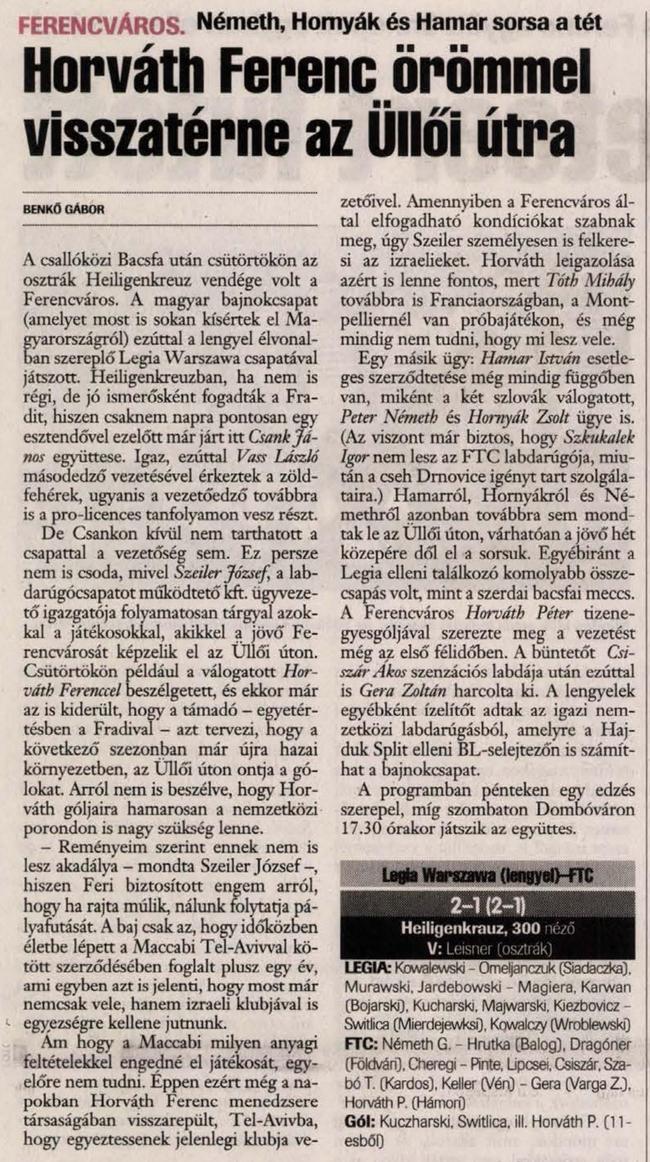 2001.VII.5. Ferencváros – Legia Warszawa: 1-2