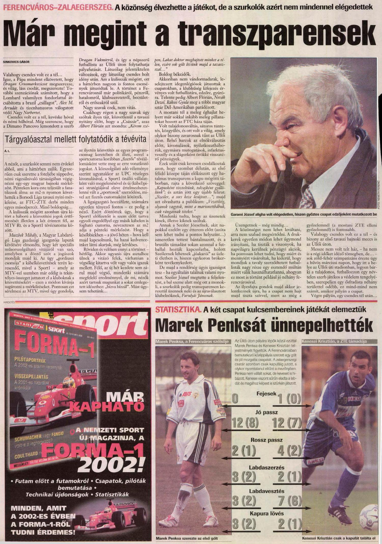 40. perc: Molnár a bal oldalról lágyan középre ívelt, Egressy 5 m-ről, a kapunak háttal állva, látványosan mozdulattal ollózott, Szűcs ritkán látható bravúrral, lábbal hárított.