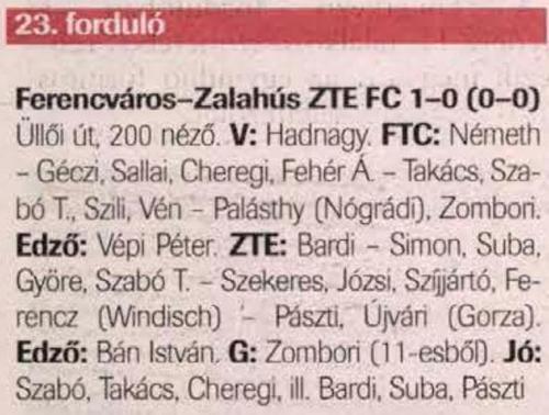 ZTE: Turi – Kocsárdi, Urbán, Král, Szamosi – Bonhcis (Nagy L. 46.), Molnár, Balog Cs. (Ljubojevic 46.), Egressy (Róth 76.) – Waltner, Kenesei