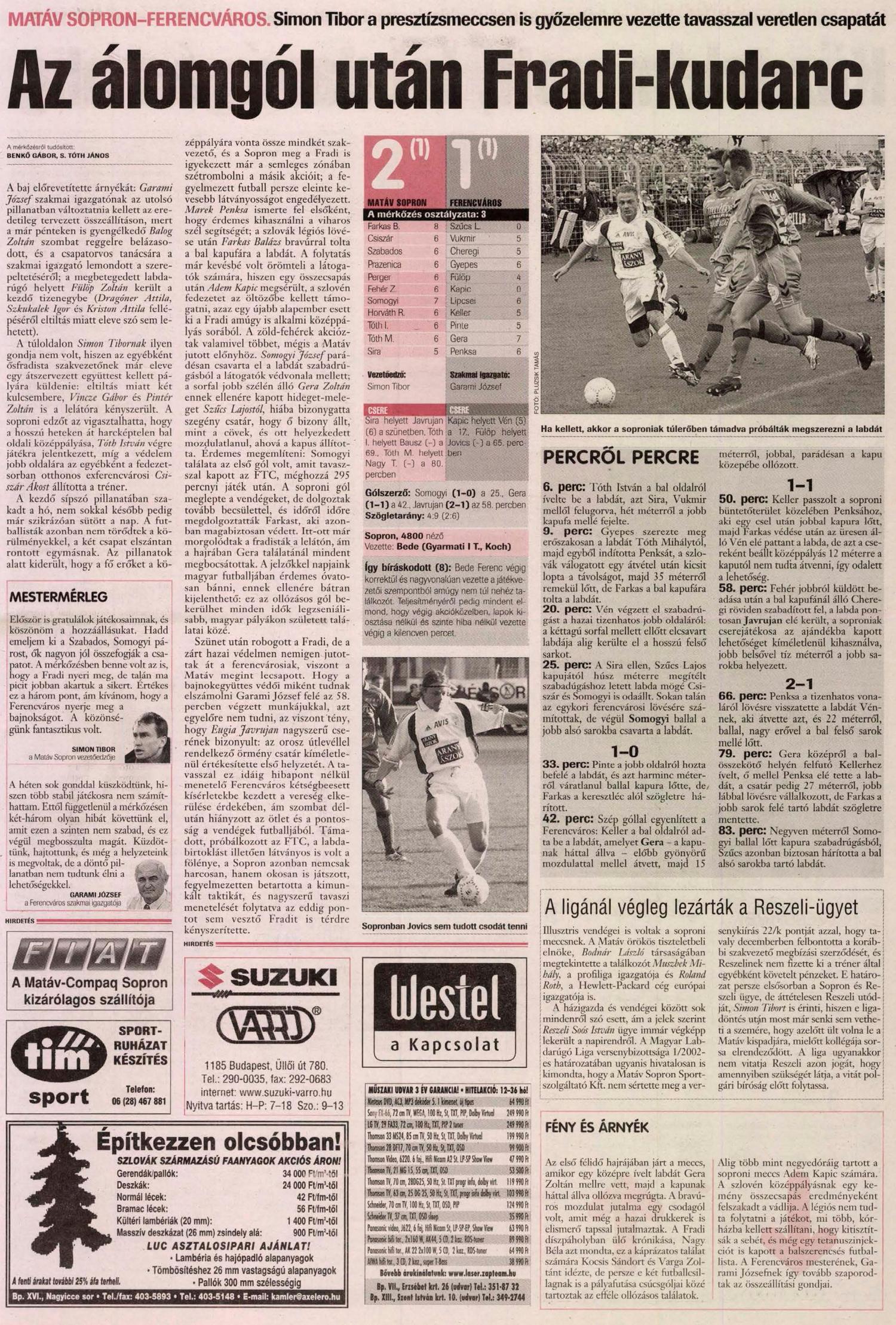 Sopronban a csapatokat meglehetősen zord időjárás várta, végig erős szél fújt a meccs alatt, sőt időnként még a hó is szállingózott. A sérülések és eltiltások miatt megtizedelt csapatunkba Garami Józsefnek már a 16. percben változtatnia kellett az amúgy is eléggé felforgatott csapaton, Kapicot súlyos sérülése miatt Vén váltotta. A szlovén légiósnak mélyen szétnyílt a vádlija, ezért kórházi ellátásra szorult, Kapicot így mentővel a soproni kórházba szállították, ahol kitisztították, majd összevarrták a sebet. A mieink a mérkőzés elejétől kezdve támadólag léptek fel, de a soproniak is vezettek néhány ügyes kontrát, sőt a Matáv távolról is gyakran veszélyeztetett, elsősorban Somogyi jóvoltából. A vezetést is egy távoli bomba után szerezte meg a Sopron, Somogyi egy szabadrúgás után szépen csavart Szűcs kapujába. (1-0) A folytatásban is a mieink uralták a játékot, és ez meghozta az eredményt: gyönyörű góllal egyenlítettünk. Gera kapott szép labdát Penksától a 16-os előtt, gyönyörűen vette át a labdát mellel, majd félfordulattal a hálóba bombázott, Farkasnak esélye sem volt a hárításra. (1-1)