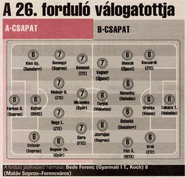 Sopron: Farkas -– Perger, Horváth R., Szabados, Prazenica -– Fehér, Somogyi, Csiszár, Tóth I. (Bausz 68.) -– Tóth M. (Nagy T. 79.), Sira (Javrujan 46.)