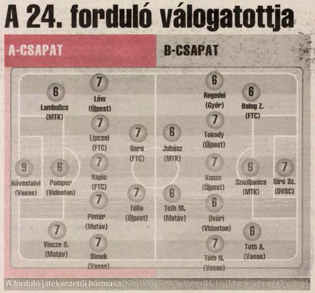Kispest: Tóth J. – Dulca, Lőrinc (Babos Á. 46.), Batrinu, Balint – Torghelle (Borgulya 46.), Kovács B., Hercegfalvi, Németh N. – Faragó, Sasu