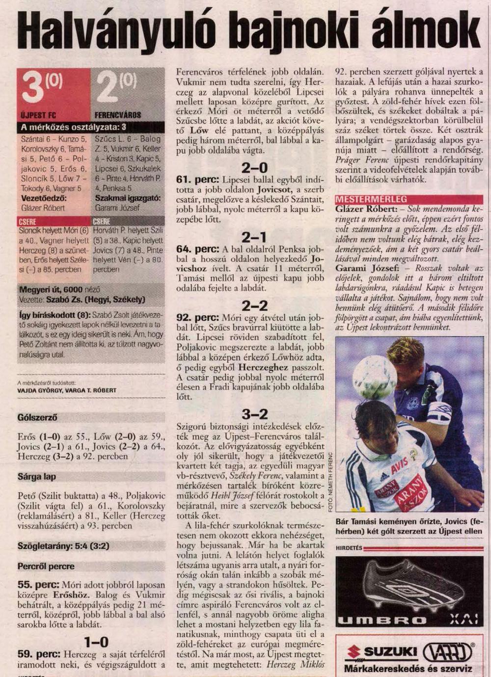 ftc.hu: Csapatunk roppant balszerencsés körülmények között kapott ki 3-2-ra a Megyeri úton az Újpesttől. Mivel az MTK és a Zalaegerszeg is nyerni tudott, jelenleg a harmadik helyen állunk a tabellán, de ha sikerül szerdán győzni Zalaegerszegen, akkor továbbra is versenyben maradunk a bajnoki címért.