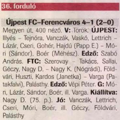 Megyeri út, 5.000 néző, vezette: Szabó Zs. (Hegyi, Székely)
