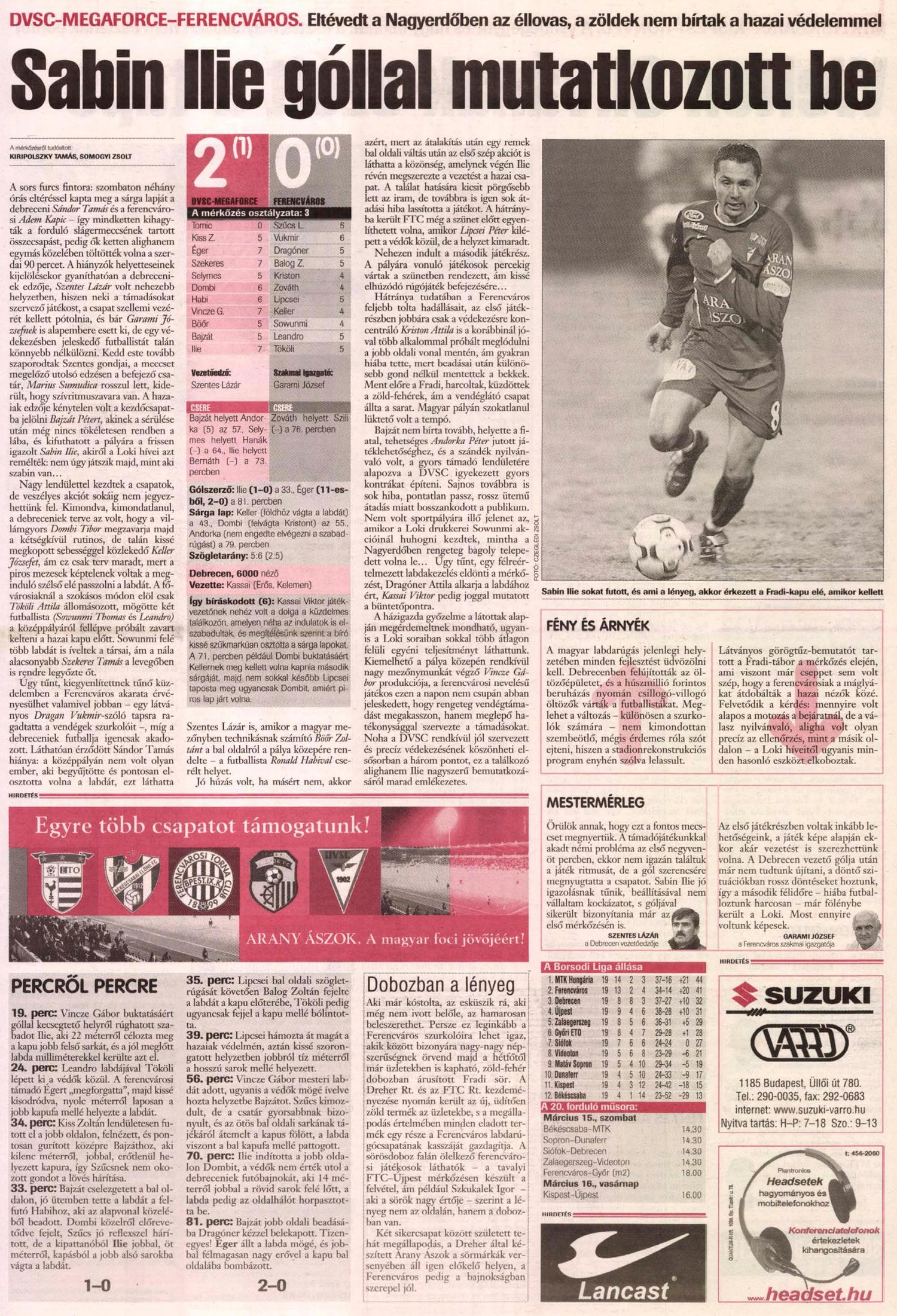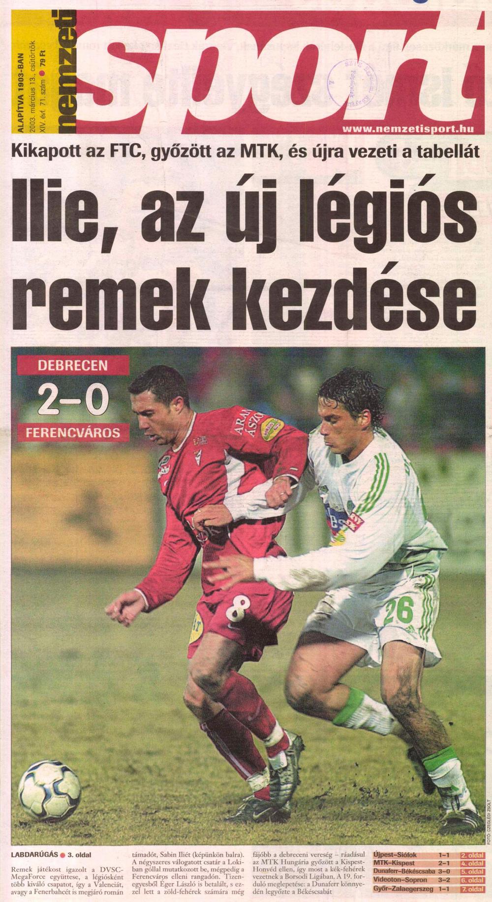 ftc.hu: Csapatunk öt zsinórban megnyert bajnoki mérkőzés után Debrecenben sajnos 2-0-ás vereséget szenvedett a hazaiaktól. A debreceniek góljait Ilie és tizenegyesből Éger szerezték.