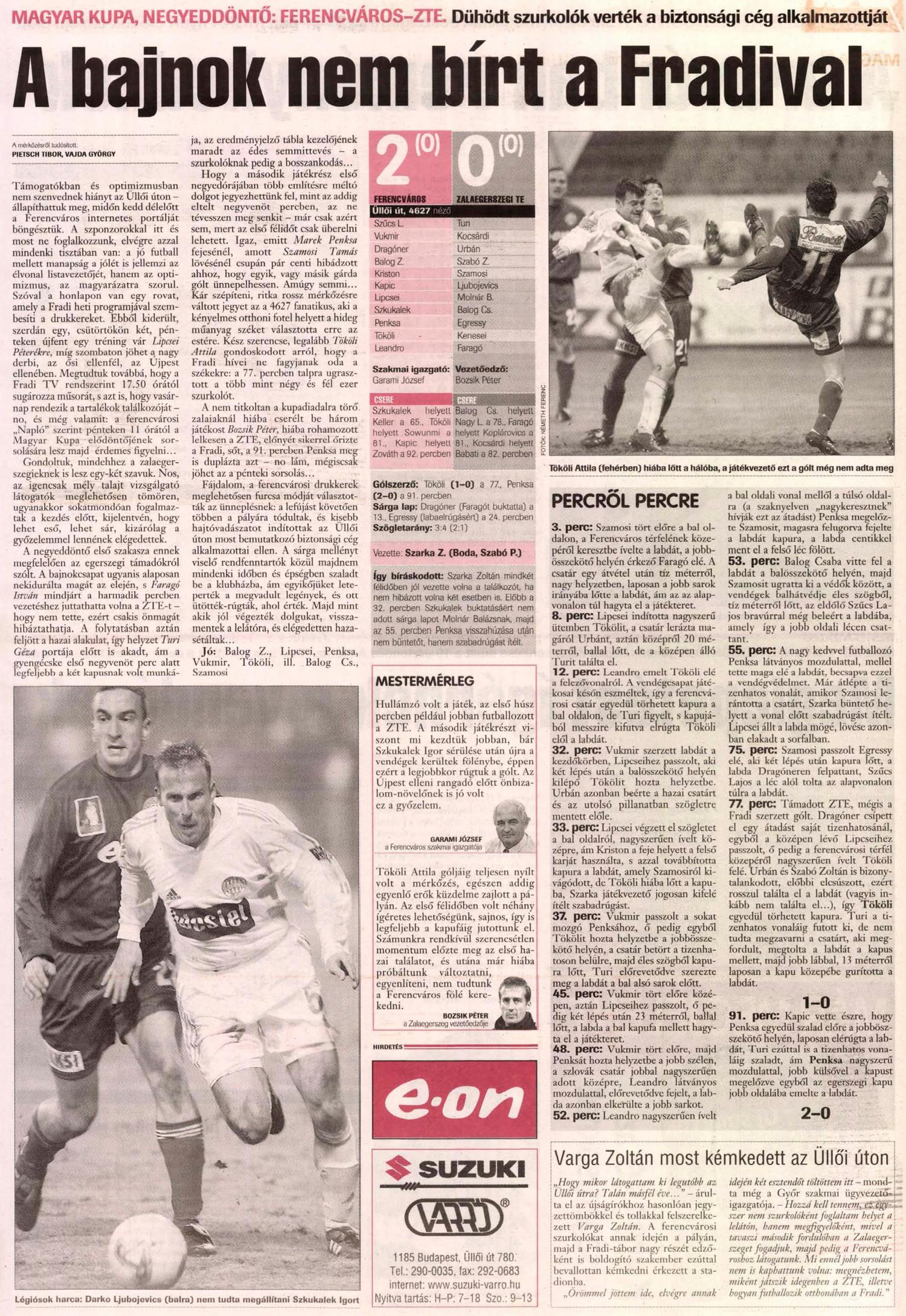 Bozsik Péter a Zalaegerszeg vezetôedzôje: – Tököli Attila góljáig teljesen nyílt volt a mérkôzés, egészen addig egyenlô erôk küzdelme zajlott a pályán. Az elsô félidôben volt néhány ígéretes lehetôségünk, sajnos, így is legfeljebb a kapufáig jutottunk el. Számunkra rendkívül szerencsétlen momentum elôzte meg az elsô hazai találatot, és utána már hiába próbáltunk változtatni, egyenlíteni, nem tudtunk a Ferencváros fölé kerekedni.