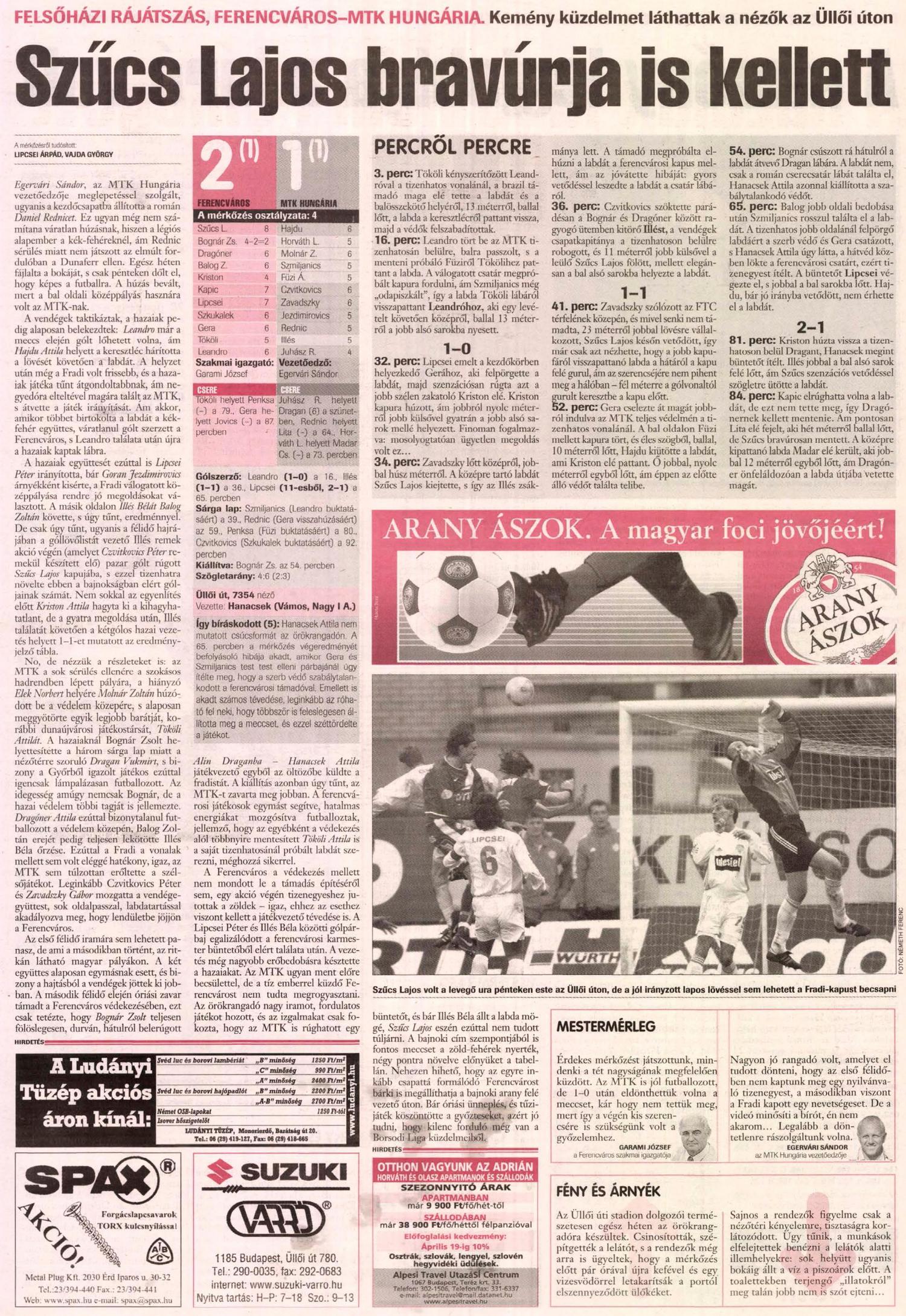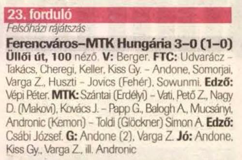 A Ferencváros a védekezés mellett nem mondott le a támadás építéséről sem, egy akció végén tizenegyeshez jutottak a zöldek – igaz, ehhez az esethez viszont kellett a játékvezető tévedése is. A Lipcsei Péter és Illés Béla közötti gólpárbaj egalizálódott a ferencvárosi karmester büntetőből elért találata után. A vezetés még nagyobb erőbedobásra késztette a hazaiakat. Az MTK ugyan ment előre becsülettel, de a tíz emberrel küzdő Ferencvárost nem tudta megrogyasztani. Az örökrangadó nagy iramot, fordulatos játékot hozott, és az izgalmakat csak fokozta, hogy az MTK is rúghatott egy büntetőt, és bár Illés Béla állt a labda mögé, Szűcs Lajos eszén ezúttal nem tudott túljárni. A bajnoki cím szempontjából is fontos meccset a zöld-fehérek nyerték, négy pontra növelve előnyüket a tabellán. Nehezen hihető, hogy az egyre inkább csapattá formálódó Ferencvárost bárki is megállíthatja a bajnoki arany felé vezető úton. Bár óriási ünneplés, és tűzijáték köszöntötte a győzteseket, azért jó tudni, hogy kilenc forduló még van a Borsodi Liga küzdelmeiből.