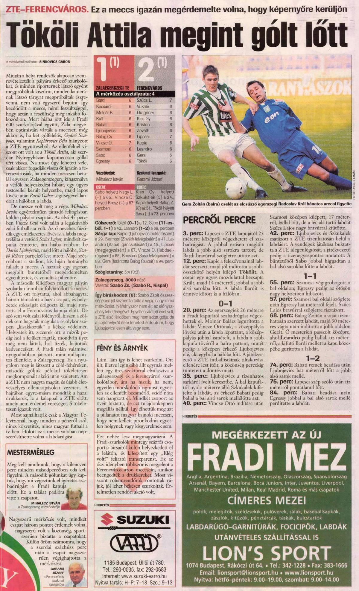 A második félidőben magyar pályán szokatlan iramban folytatódott a meccs. A ZTE ott folytatta, ahol abbahagyta; bátran támadott a hazai csapat, és helyzetek sokaságát dolgozta ki, majd rontotta el a Ferencváros kapuja előtt. De szó sem volt zalai fölényről, hiszen a zöldek sem hagyták magukat, és olykor szépen „kisakkozták” a kékek védelmét. Helyzetek itt, ziccerek ott, a nézők pedig hol a fejüket fogták, mondván ilyet még nem láttak, hol űzték, hajtották kedvenceiket. A Fradi talán valamivel nyugodtabban játszott, mint nullapontos ellenfele, a Zalaegerszeg. Ez a nyugalom meg is látszott a zöld-fehéreken, második góljuk például tökéletesen megkomponált akció után született. Ám a ZTE nem hagyta magát, és újabb életveszélyes ellencsapásokat vezetett. A hajrában egyre-másra mondták a hazai drukkerek, le a kalappal a ZTE előtt, amely nem érdemel vereséget. S tökéletesen igazuk volt.