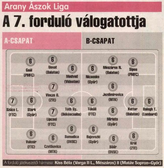 Ferencváros: Szűcs L. – Kriston, Vukmir, Dragóner, Kiss Gy. (Szkukalek 34.) – Kapic (Balog Z. 50.), Lipcsei, Zováth – Gera, Tököli (Sasu 72.), Leandro