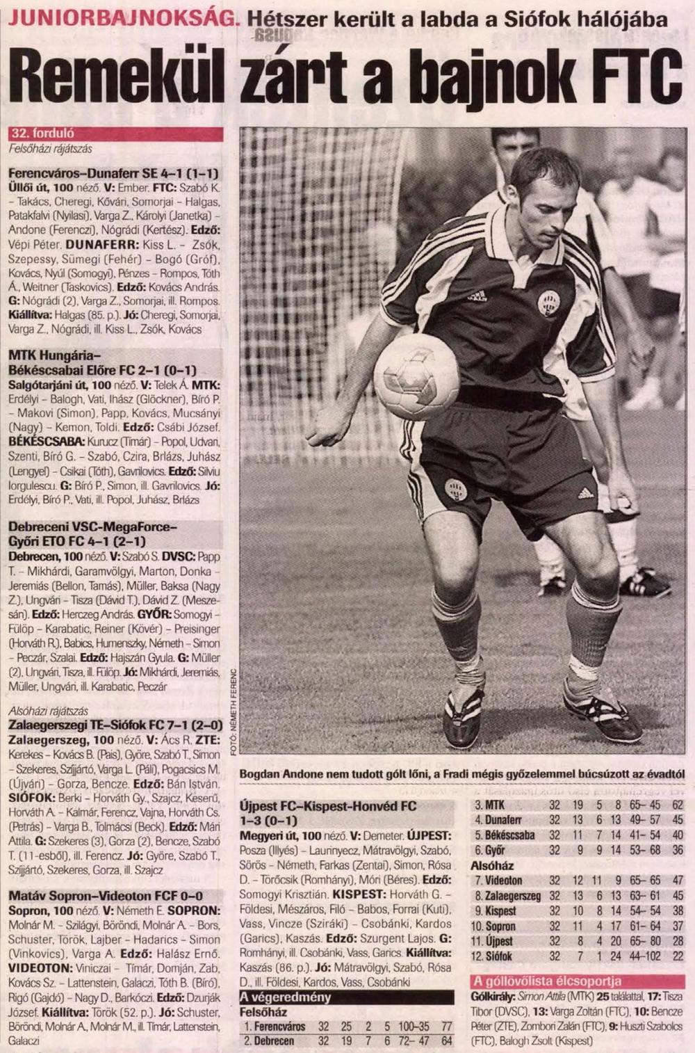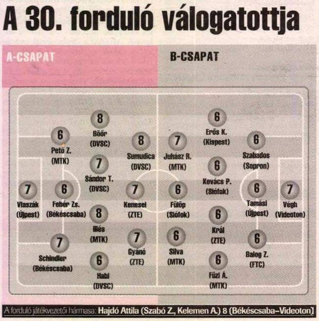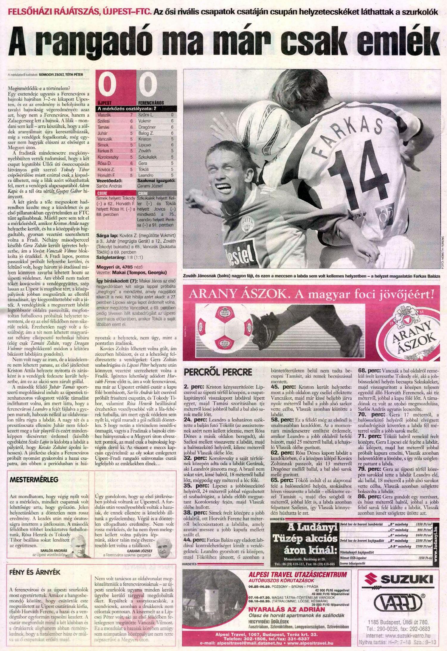 Kovács Zoltán lőhetett volna gólt, ám ziccerben hibázott, és ez a lehetőség felébresztette a vendégeket: Gera Zoltán szabadrúgása és Lipcsei Péter helyzete után könnyen vezetést szerezhetett volna a Fradik. Ígéretes lehetőség adódott Horváth Ferenc előtt is, ám a volt ferencvárosi, ma már az Újpestet erősítő csatár a kapu fölé bombázott, Sarlós András két cserével próbált frissíteni csapatán, és Tokody Tibor, valamint Rósa Henrik beállásával érezhetően veszélyesebbé vált a lila-fehérek futballja, ám mert egyik védelem sem nyílt ki, végül maradt a gól nélküli döntetlen. S hogy netán a történelem ismétli-e önmagát, vagyis a Fradinak a bajnoki címhez hiányoznak-e a Megyeri úton elvesztett pontok, az majd csak a bajnokság legvégén derül ki. Az viszont e meccs kapcsán egyértelmű: az oly sokat emlegetett Újpest–Fradi rangadó színvonalas csatái legfeljebb az emlékekben élnek…