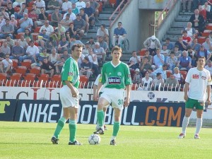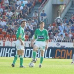 A nagy meleg ellenére óriási iramban kezdtünk és ez láthatóan meglepte a hazaiakat. A 3. percben Balog hatalmas bedobása után a bevetődő Gera lábáról még a kapu fölé pattant a labda, védőnk újabb „szöglete” a 9. percben azonban már gólt ért. Gera Sebőköt megelőzve tovább fejelte a labdát, amit a hosszú saroknál helyezkedő Tököli 3 méterről az üres kapuba bólintott (0-1). Vezetésünk után sem csökkentettük az iramot és ez hamar meghozta a várt eredményt. A 12. percben Gera parádés cselekkel két védőt is becsapott, majd kapura lőtt, Sebők csak kiütni tudta a labdát, amely Tököli elé pattant és csatárunk ismét pár lépésről helyezett az üres kapuba (0-2). Kétgólos előnyünk birtokában kicsit visszavettünk a tempóból, kiegyenlített lett a küzdelem, de a kapunk előtt nem alakult ki komoly gólhelyzet. A hazaiak több szögletet is elvégezhettek, de a kapu előtti fejpárbajokat védőink nyerték. Szűcsnek a 27. percben kellett először játékba avatkoznia, amikor Baumgartner veszélyesen becsavart beadása után elütötte a labdát Bajevski elől. A 33. percben Kriston a jobb szélről egyedül tört kapura, de lecsúszott a lábáról a labda. A hazaiak is kihagytak még egy helyzetet, Bajevski ollózásos lövését védte Szűcs.
