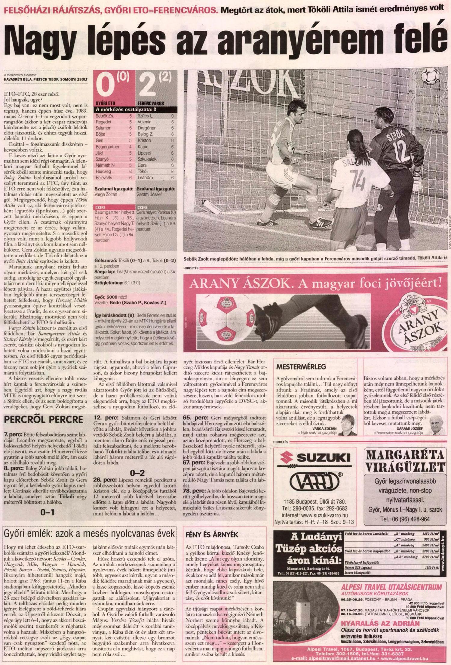 E kevés néző azt látta: a Győr nyomaiban sem idézi régi önmagát. A jelenkori magyar futballt figyelemmel kísérők közül szinte mindenki tudja, hogy Balog Zoltán bedobásaiból próbál veszélyt teremteni az FTC, úgy tűnt, az ETO erre nem volt felkészülve, és a hatalmas dobás után megszületett az első gól. Megjegyzendő, hogy éppen Tököli Attila volt az, aki ferencvárosi játékosként legutóbb (áprilisban…) gólt szerzett bajnoki mérkőzésen, és éppen a Győr ellen. A csatárnak olyannyira megtetszett ez az érzés, hogy villámgyorsan megismételte. S a második gól olyan volt, mint a legjobb hollywoodi film: a látványt és a komikumot sem nélkülözte. Gera Zoltán ugyanis megszédítette a védőket, de Tököli találatához a győri Böjte Attila segítsége is kellett.