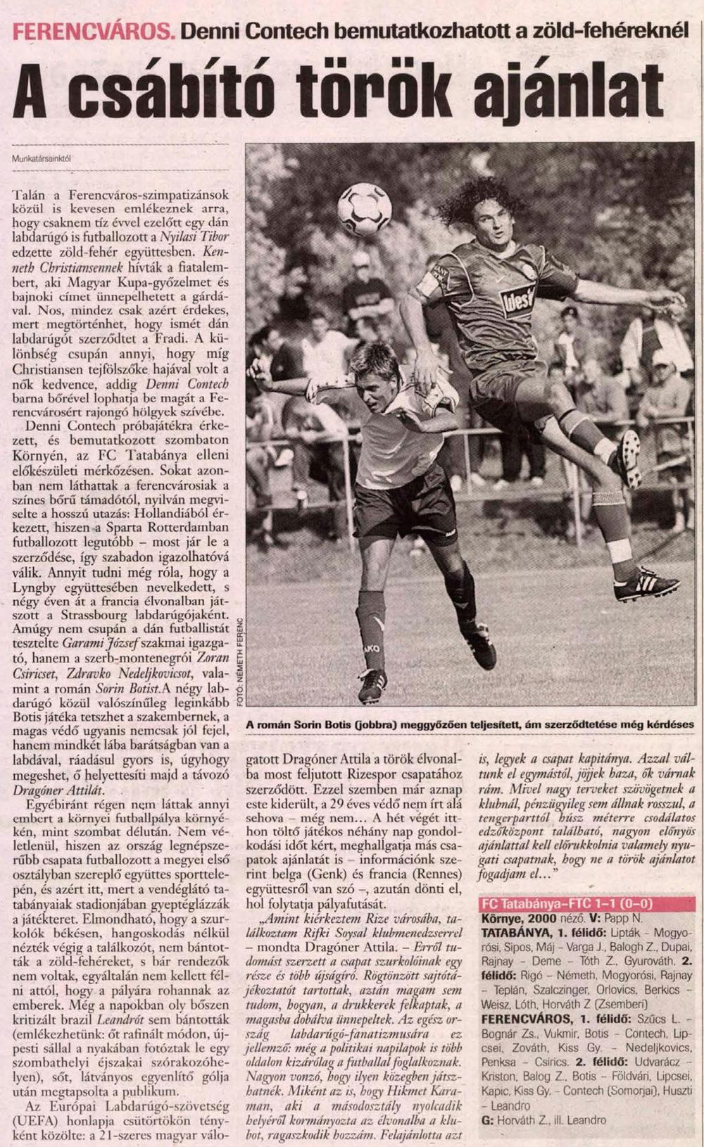 Denni Contech próbajátékra érkezett, és bemutatkozott szombaton Környén, az FC Tatabánya elleni előkészületi mérkőzésen. Sokat azonban nem láthattak a ferencvárosiak a szí­nes bőrű támadótól, nyilván megviselte a hosszú utazás: Hollandiából érkezett, hiszen a Sparta Rotterdamban futballozott legutóbb – most jár le a szerződése, í­gy szabadon igazolhatóvá válik. Annyit tudni még róla, hogy a Lyngby együttesében nevelkedett, s négy éven át a francia élvonalban játszott a Strassbourg labdarúgójaként. Amúgy nem csupán a dán futballistát tesztelte Garami József szakmai igazgató, hanem a szerb-montenegrói Zoran Csiricset, Zdravko Nedeljkovicsot, valamint a román Sorin Botist.A négy labdarúgó közül valószí­nűleg leginkább Botis játéka tetszhet a szakembernek, a magas védő ugyanis nemcsak jól fejel, hanem mindkét lába barátságban van a labdával, ráadásul gyors is, úgyhogy megeshet, ő helyettesí­ti majd a távozó Dragóner Attilát.