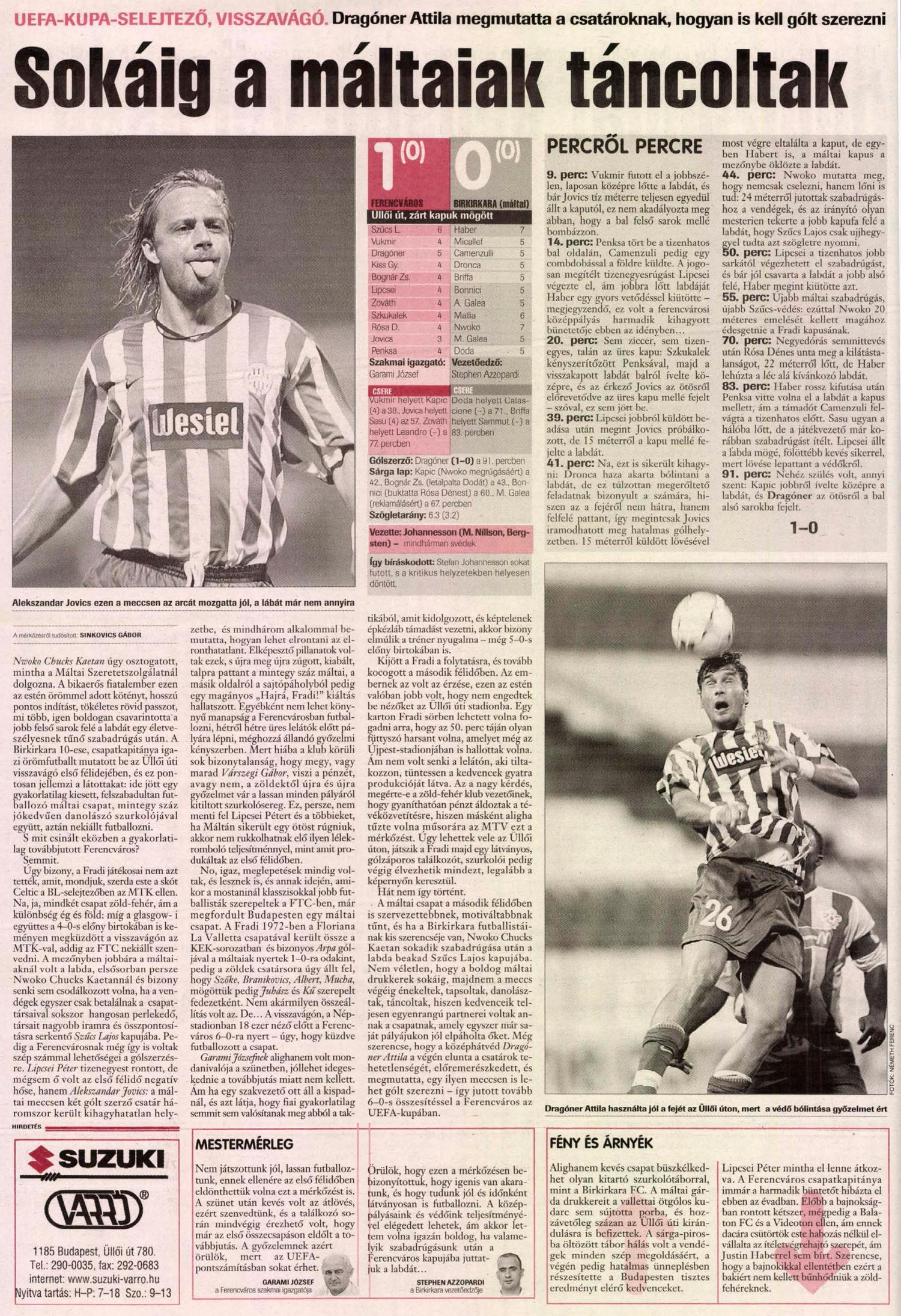 A máltai csapat a második félidőben is szervezettebbnek, motiváltabbnak tűnt, és ha a Birkirkara futballistáinak kis szerencséje van, Nwoko Chucks Kaetan sokadik szabadrúgása után a labda beakad Szűcs Lajos kapujába. Nem véletlen, hogy a boldog máltai drukkerek sokáig, majdnem a meccs végéig énekeltek, tapsoltak, danolásztak, táncoltak, hiszen kedvenceik teljesen egyenrangú partnerei voltak annak a csapatnak, amely egyszer már saját pályájukon jól elpáholta őket. Még szerencse, hogy a középhátvéd Dragóner Attila a végén elunta a csatárok tehetetlenségét, előremerészkedett, és megmutatta, egy ilyen meccsen is lehet gólt szerezni – így jutott tovább 6–0-s összesítéssel a Ferencváros az UEFA-kupában.