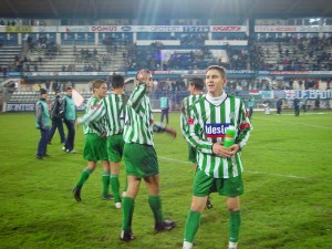 Most jöttek ki a játékosok a pályára. A hazaiak fehér mezben, kék nadrágban és fehér sportszárban játszanak, a mieink zöld-fehér csíkos mezben, zöld nadrágban és zöld sportszárban veszik fel a küzdelmet a házigazdákkal.