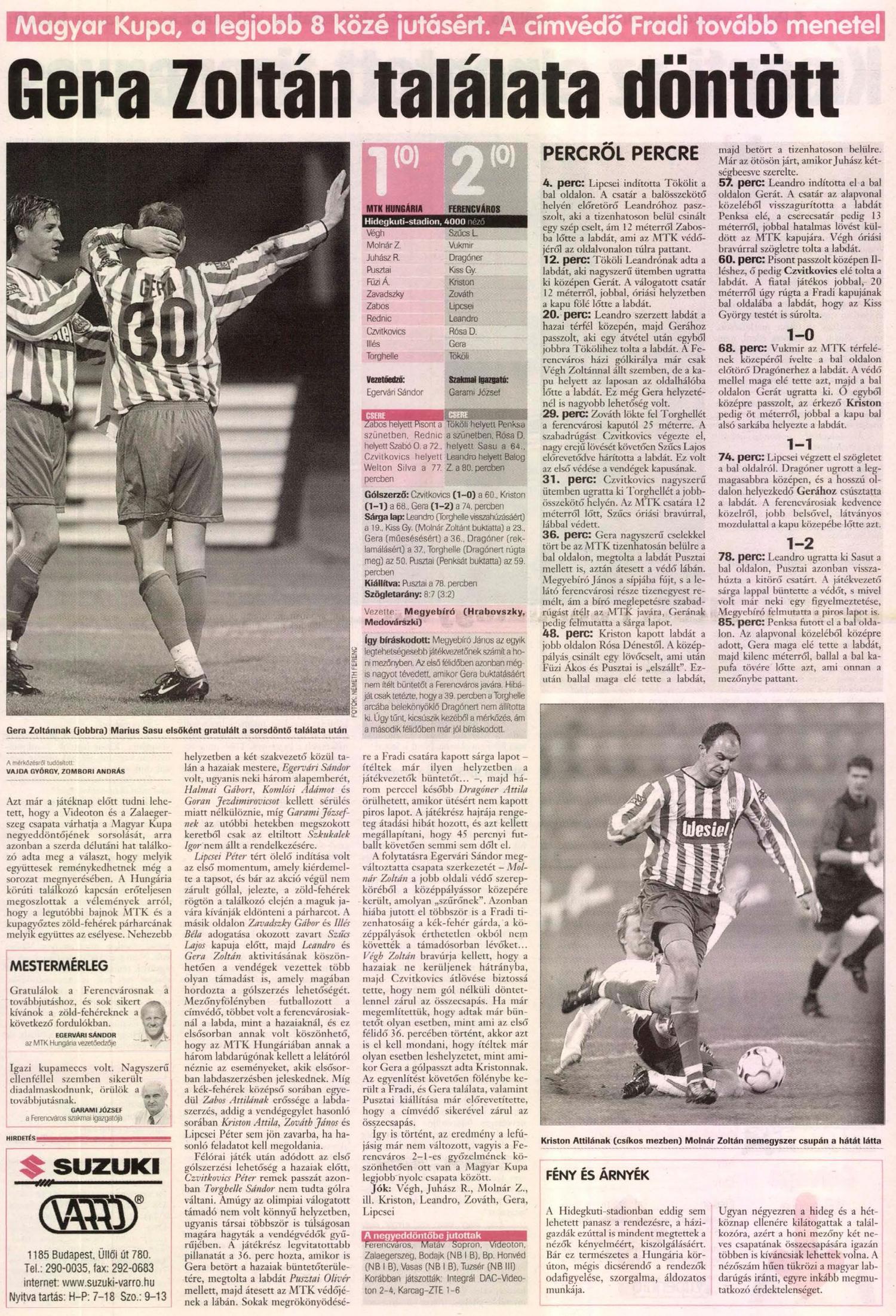 ftc.hu: Csapatunk fegyelmezett, jó játékkal idegenben gyõzte le az MTK-t és bejutott a Magyar Kupa negyeddöntõjébe. A rendkívül hideg idõben jó iramú, izgalmas meccset vívott egymással a két együttes.