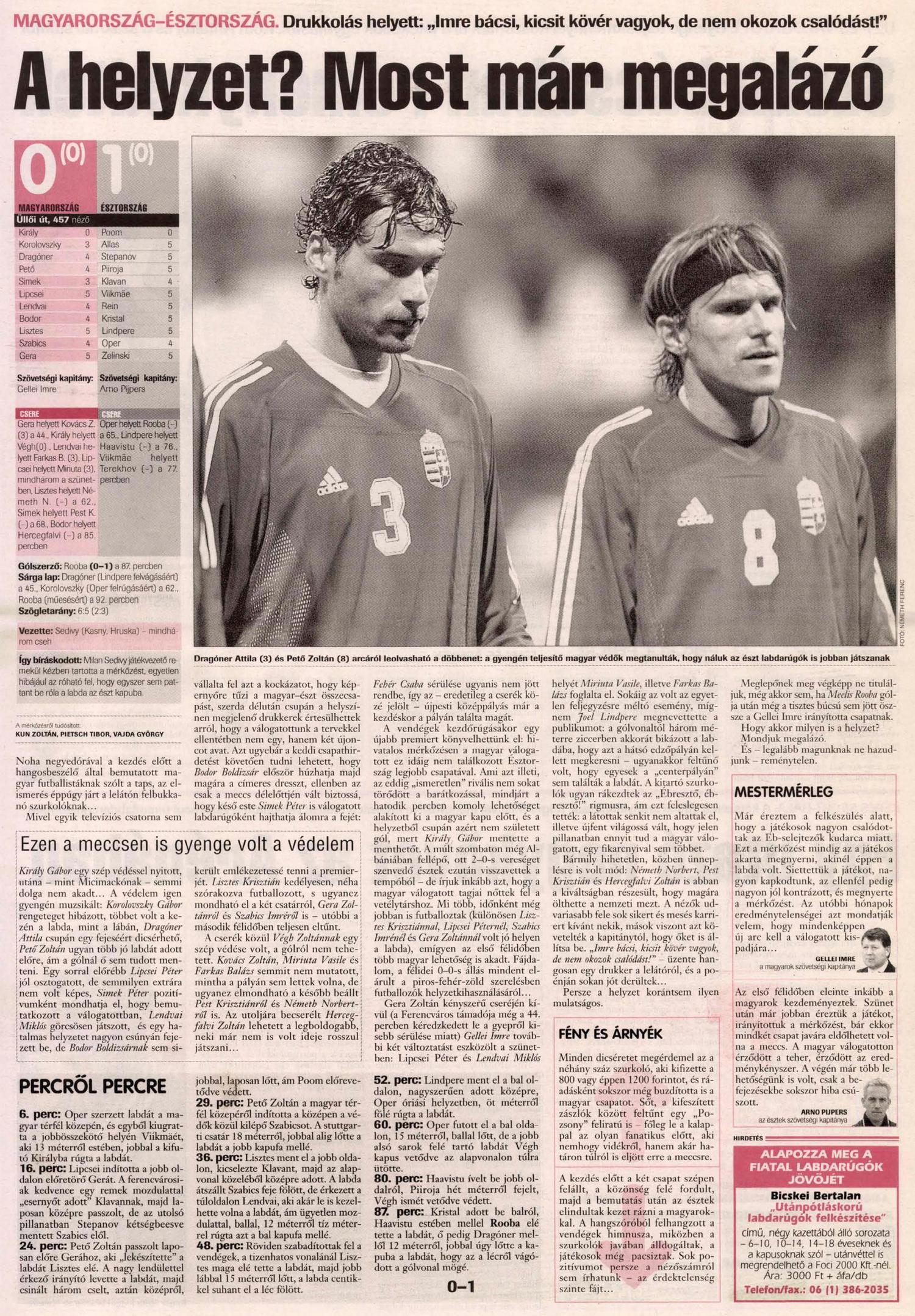 A szünet utáni percek reményt ébresztettek a szurkolókban, egy-két ígéretes magyar támadást láthattak, de utána siralmas „játék”, rengeteg hiba következett, úgy tűnt, hogy a hazaiak nem ismerik egymást, általában az észt futballistákkal próbáltak összjátékot kezdeményezni… Az utolsó félóra szánalmas erőlködést hozott, amelynek „megkoronázásaként” gólt szereztek a vendégek, amit az elkeseredett drukkerek ovációval fogadtak!