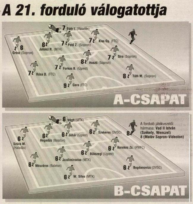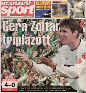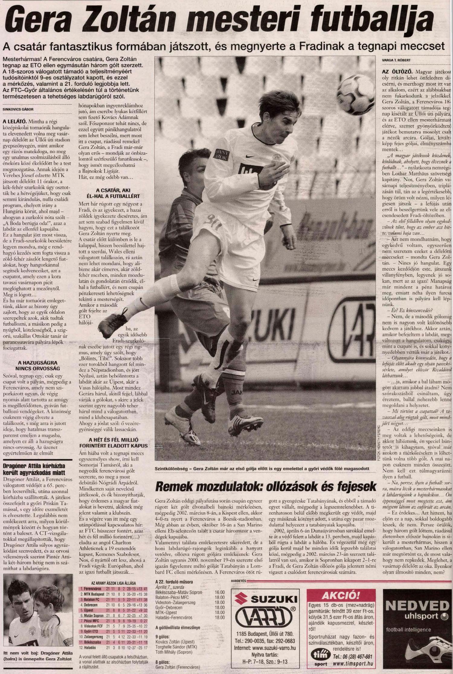 A csatár előtt különben is le a kalappal, hiszen becsülettel hajtott a szerdai, Wales elleni válogatott találkozón, rá aztán nem lehet mondani, hogy alibizne akár címeres, akár zöld-fehér mezben, minden mozdulatán és gondolatán érződik, él-hal a futballért, és nem csupán pénzkereseti lehetőségnek tekinti a mesterségét. Amikor a második gólt fejelte az ETO hálójába, az egyik idősebb Fradi-szurkolónak eszébe jutott egy régi rigmus, amely úgy szólt, hogy „Bólints, Tibi!”. Sokszor több ezer torokból hangzott fel mindez a Népstadionban, és jött Nyilasi, aztán bebólintotta a labdát akár az Újpest, akár a Vasas hálójába. Most mindez Gerára hárul, akitől fejjel, lábbal várják a gólokat, s akire a jelek szerint egyre nagyobb teher hárul mind a válogatottban, mind a klubcsapatában.