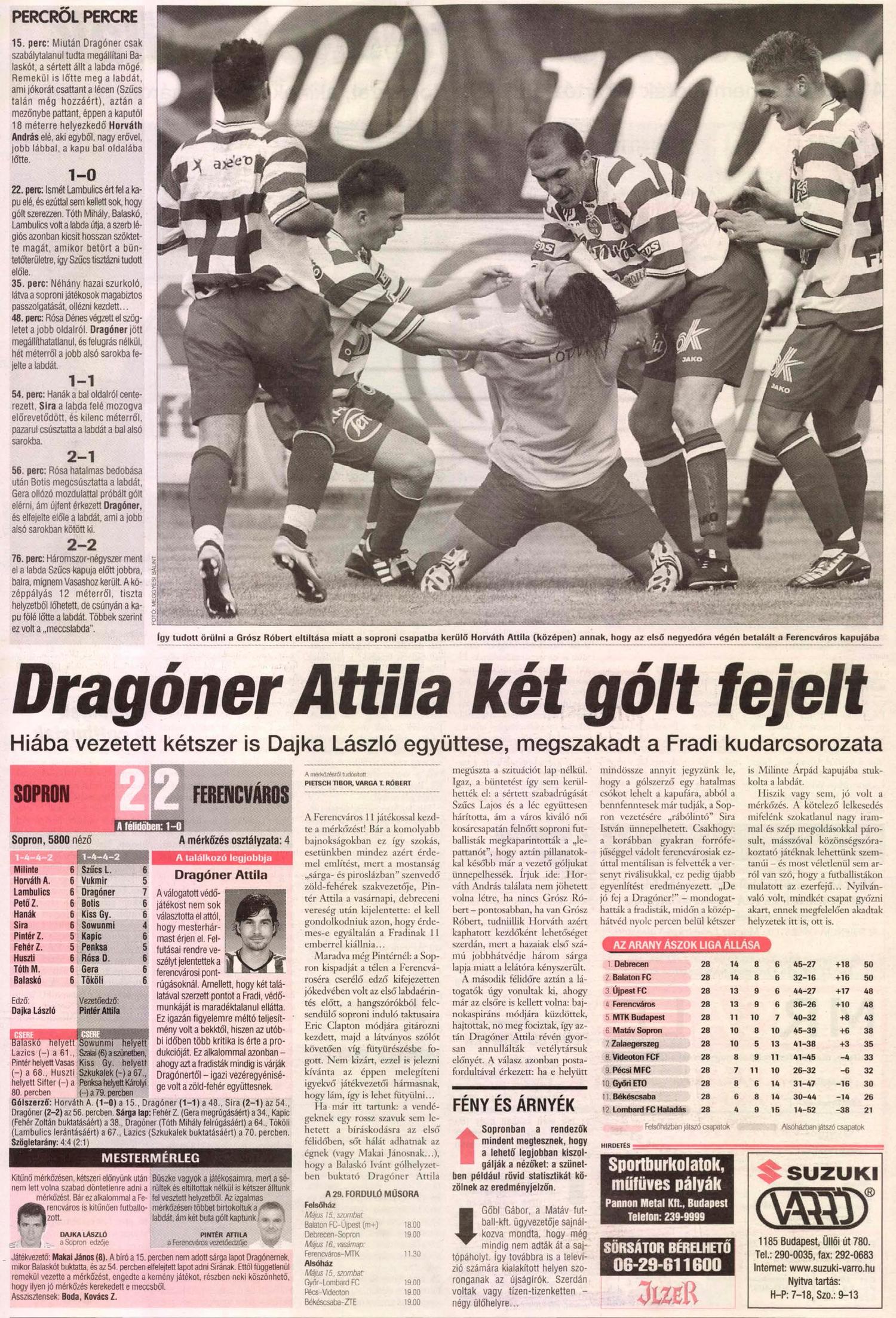 Dragóner Attila: – Nagyon boldog vagyok, hiszen még soha nem szereztem két gólt egy meccsen. Ehhez azonban az is kellett, hogy nagyon jó labdákat kapjak, nekem „csak” oda kellett tartanom a fejem. Sajnálom, hogy nem sikerült mesterhármast elérnem, de a második gólom után a lövésem egy védőről a kapu fölé pattant. Más körülmények között Sopronban a döntetlen is jó eredménynek számítana, nekünk azonban a bajnoki címért folyó kiélezett verseny miatt most óriási szükségünk lett volna a három pontra. Remélem, a vasárnapi örökrangadón sikerül nyernünk és akkor továbbra is versenyben maradunk a bajnoki címért. Szeretnék köszönetet mondani mindenkinek, aki a hétköznap este és nagy távolság ellenére ide is elkísért bennünket és szurkolásával hozzájárult ahhoz, hogy kétszer is talpra tudjunk állni. Bízom benne, hogy vasárnap az Üllői úton sokan eljönnek biztatni minket és akkor talán nemcsak jól játszunk, hanem a szurkolóink támogatásával a három pontot is sikerül megszereznünk.