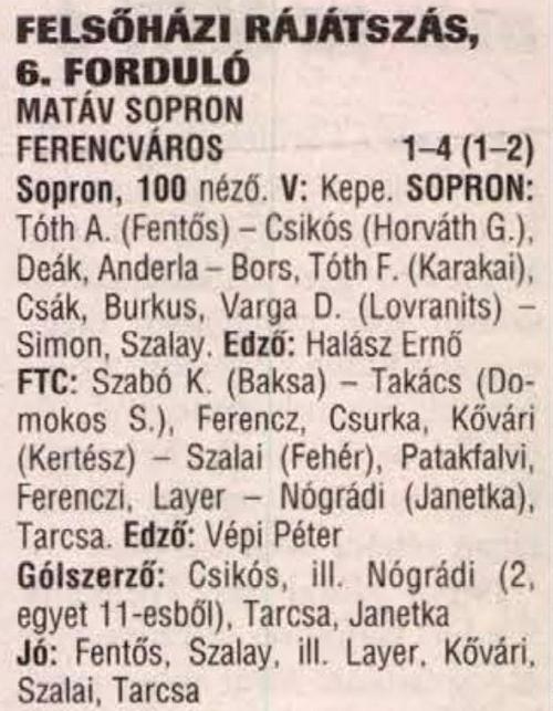 Matáv-Sopron: Milinte – Fehér, Horváth, Hanák, Petõ – Lambulic, Pintér (Vasas 69.), Balaskó (Lazic 60.), Huszti (Sifter 79.) – Sira, Tóth M.