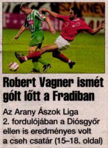 Aztán a mérkőzés 32. percében Horváth Tibor hatalmas helyezkedési hibát követett el a diósgyőri védelem jobb oldalán, és noha a labda némi szerencsével jutott el Robert Vagnerhez, a cseh légiós könyörtelenül büntetett. A Cottbusból érkezett támadó harmadik ferencvárosi mérkőzésén már a negyedik találatát szerezte.