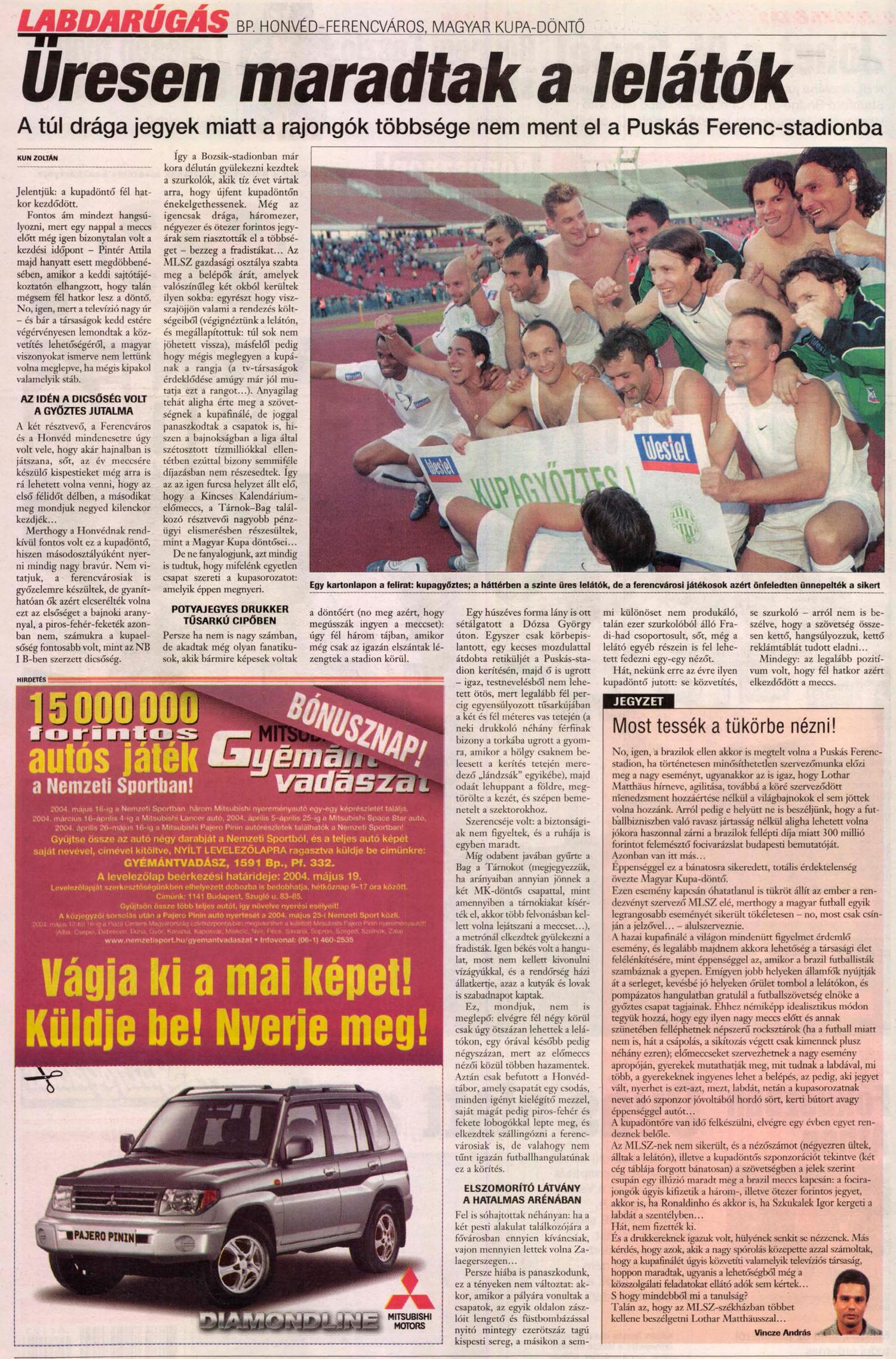A május 5.-i Magyar Kupa döntőjére a Puskás Ferenc stadionban került sor, mindösszesen négyezer néző előtt. Miért voltunk csak ennyien? Nehéz rá válaszolni, de talán összefügg azzal, amit az előbb írtam: bár voltak sikerek, de 2004 tavaszán már gyülekeztek a sötét felhők. Pintér Attilának sem sikerült igazán elfogadtatnia magát a közönséggel, és sajnos a játékosokkal sem. Ehhez jött még, hogy a jegyárak sem igazodtak a „valósághoz”. Ettől függetlenül egyértelmű esélyesei voltunk a kupadöntőnek, hiszen a magyar kupadöntő idején a Bp. Honvéd még az NB I/B listavezetője volt.