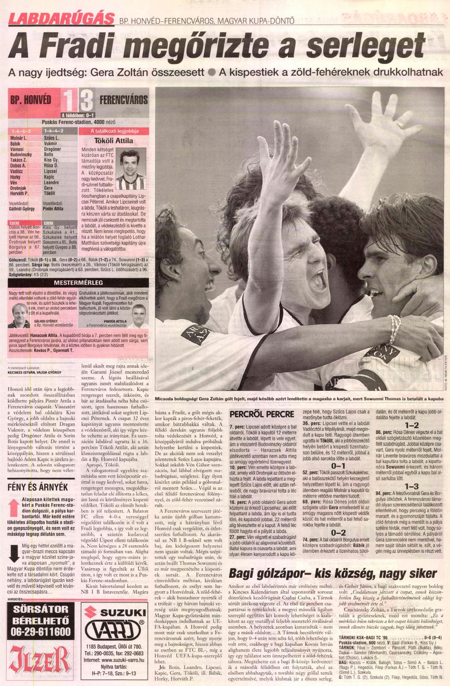 A 36. percben egy szenzációs labdával ugratta ki Tökölit, aki aztán klasszismegoldással rúgta a labdát a Honvéd kapujába. A gólja mellett Tököli végig nagy kedvvel, sokat futva játszott, rendre megoldhatatlan feladat elé állította a védőket. A második gólunk Gera Zoli bólintotta Rósa szögletéből. Néhány perc múlva a Honvéd elég váratlanul szépített, de a hajrában jött a második gólunk „kopírja”, Rósa szögletéből megint Gerzson bólintott, de ezt most Molnár kapus bravúrra a bal kapufára tudta tolni, de jött Sowunmi és néhány méterről a kapu bal alsó sarkába lőtt, ezzel véglet lezárva a kupadöntőt. A hosszabbítás még hozott egy kis izgalmat, Gera „ütközött” Borgulyával, Zoli a gyomorszáját fájlalta, a mentő is készenlétben állt, de nem volt rá szükség, Gerzson a lefújás után már együtt ünnepelt a társakkal.