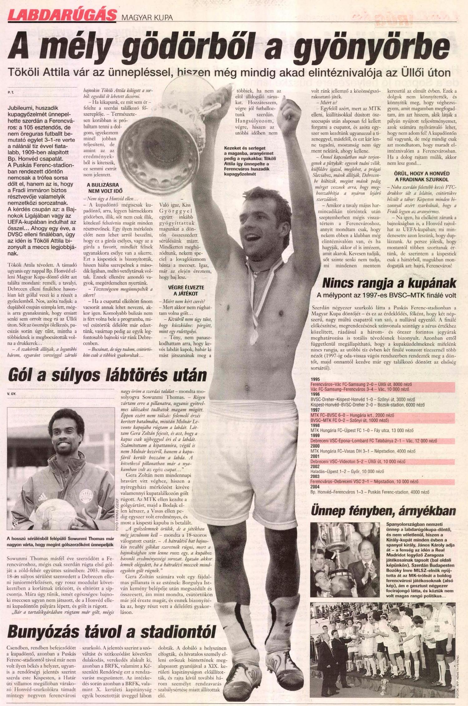Sowunmi Thomas: – Az utóbbi időben szinte mindig a kispadon voltam, ám eddig csak a Vasas elleni kupameccsen kaptam lehetőséget. Bíztam benne, hogy becserél Pintér Attila, de biztos egyáltalán nem voltam benne, pláne hogy a legutóbbi tartalék meccsen nem ment olyan jól a játék, mint a korábbiakon, amikor gólt is szereztem. Véleményem szerint az edzésmunkám alapján döntött a becserélésem mellett Pintér Attila, hiszen sokat dolgoztam, küzdöttem azért, hogy bekerüljek a csapatba. Az edzőm egyébként a meccs előtt azt mondta, hogy úgy készüljek, hogy amennyiben becserél, a jobb oldalon kapok szerepet, ehhez képest, a baloldalra küldött be. A lényeg azonban nem is ez, hanem hogy végre játszhattam, ráadásul megszereztem az első gólomat a Fradiban! Ez volt a harmadik kupadöntőm, és a második győzelmem. 2000-ben a Vasas színeiben játszottam az első finálét, akkor azonban 3-1-re kikaptunk az MTK-tól. Tavaly már a győztes oldalon szerepeltem, ám annak a sikernek csak a kispadon lehettem részese. Nagyon boldog vagyok, hogy ehhez a kupagyőzelemhez már én is hozzájárulhattam.