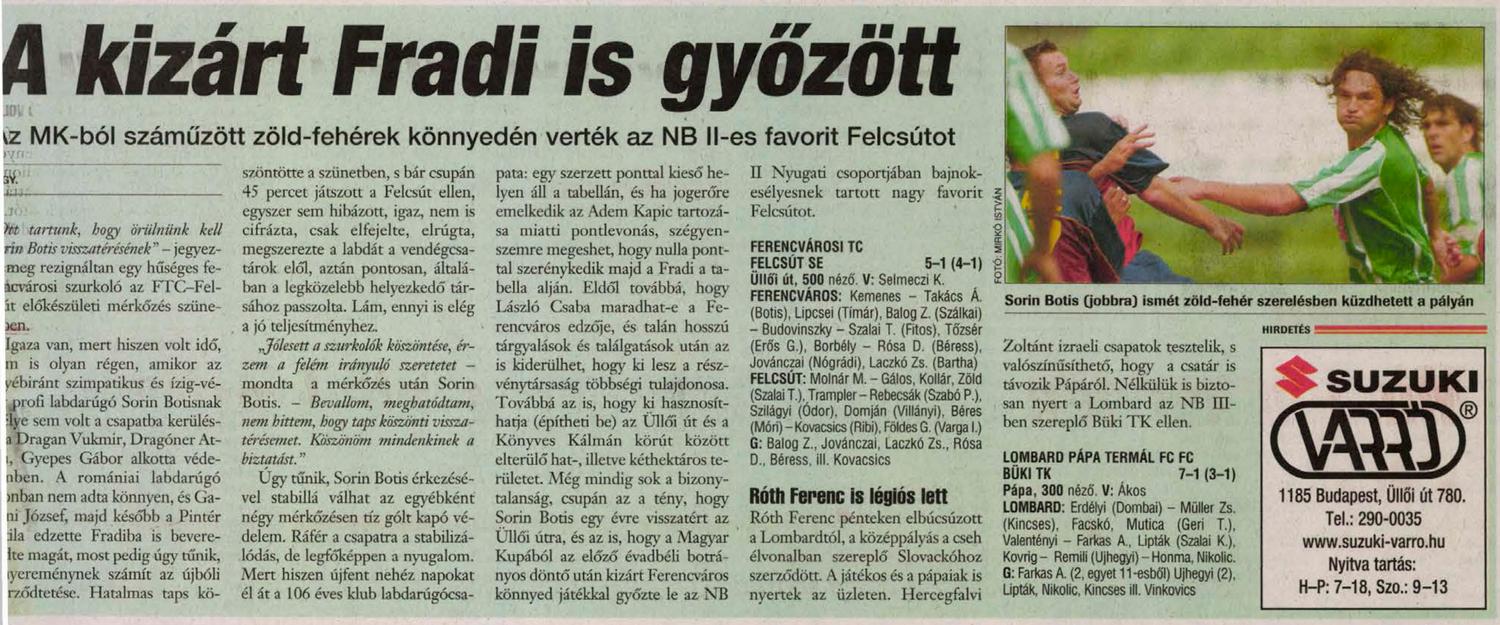 „Ott tartunk, hogy örülnünk kell Sorin Botis visszatérésének” – jegyezte meg rezignáltan egy hűséges ferencvárosi szurkoló az FTC-Felcsút előkészületi mérkőzés szünetében. Igaza van, mert hiszen volt idő, nem is olyan régen, amikor az egyébiránt szimpatikus és ízig-vérig profi labdarúgó Sorin Botisnak esélye sem volt a csapatba kerülésre a Dragan Vukmir, Dragóner Attila, Gyepes Gábor alkotta védelemben.