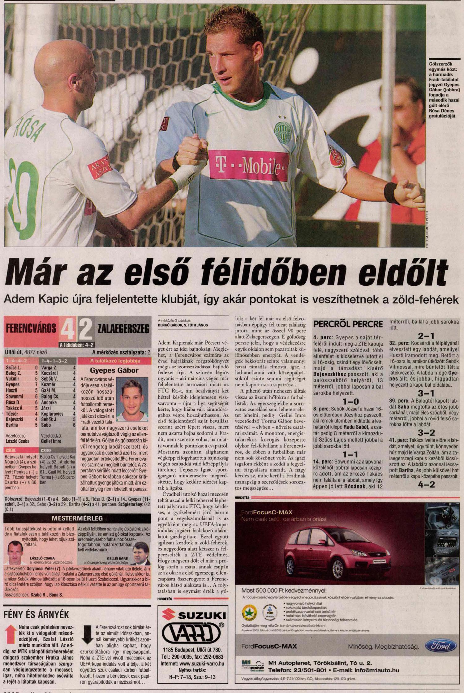 A második játékrészt mindkét együttes visszafogottabban kezdte. Mi kétgólos előnyünk birtokában nem erőltettük a támadásokat és sokáig a zalaiak sem mertek olyan intenzitással támadni, mint az első félidőben. Az utolsó 20 percre változott a helyzet, a vendégek mindent egy lapra feltéve három támadóval próbáltak rohamozni és mezőnyfölénybe is kerültek, de így nekünk is több lehetőségünk nyílt az ellentámadásokra. Rósa lövésénél Varga bravúrja mentette meg a Zalaegerszeget az újabb kapott góltól, de Szűcs is szép mozdulattal hárította Koplárovics bombáját. Az utolsó percekben magabiztosan őriztük előnyünket. Mai győzelmünk azt jelenti, hogy továbbra is versenyben vagyunk az UEFA Kupa-szereplést jelentő második helyért. Nyíregyházi győzelme után az MTK is odaérhet a második helyre. A holnapi Újpest-Győr találkozó után eldől, hogy ki lesz a harmadik résztvevője az utosó fordulóban az ezüstéremért folyó versenynek, vagy esetleg az újpestiek és a győriek is versenyben maradnak.