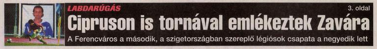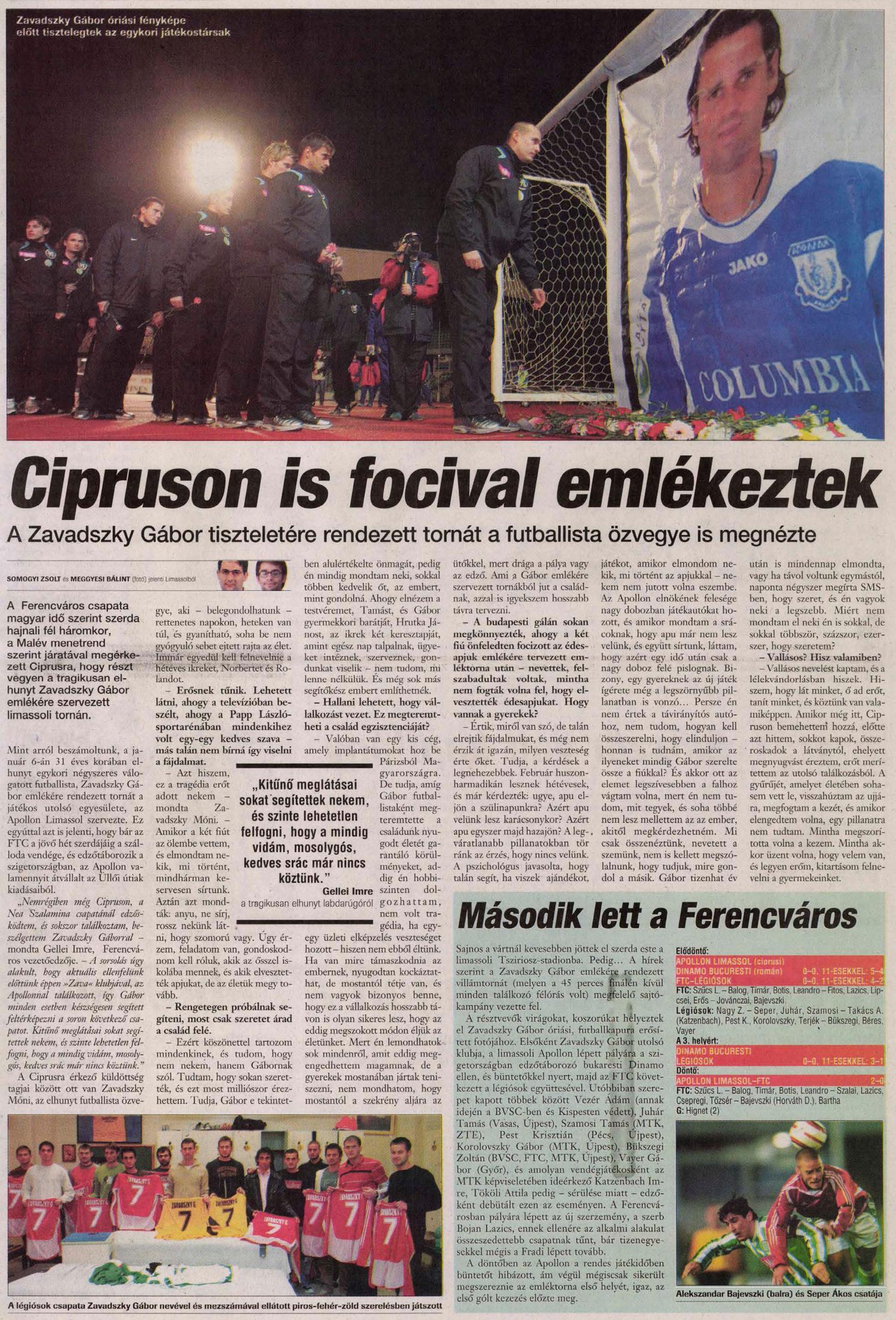 Második helyen végzett csapatunk a Limasszolban Zavadszky Gábor emlékére megrendeztett tornán, miután a döntőben 2-0-ás vereséget szenvedett az Apollontól. A tornát így a házigazda Apollon Limasszol (az Apollon büntetőt is hibázott) nyerte, a mieink a második helyen végeztek. A harmadik a bronzmeccsen a Cipruson légioskodó magyarokból álló gárdát 0-0-ás rendes játékidő után tizenegyesekkel legyőző Dinamo Bucuresti lett.