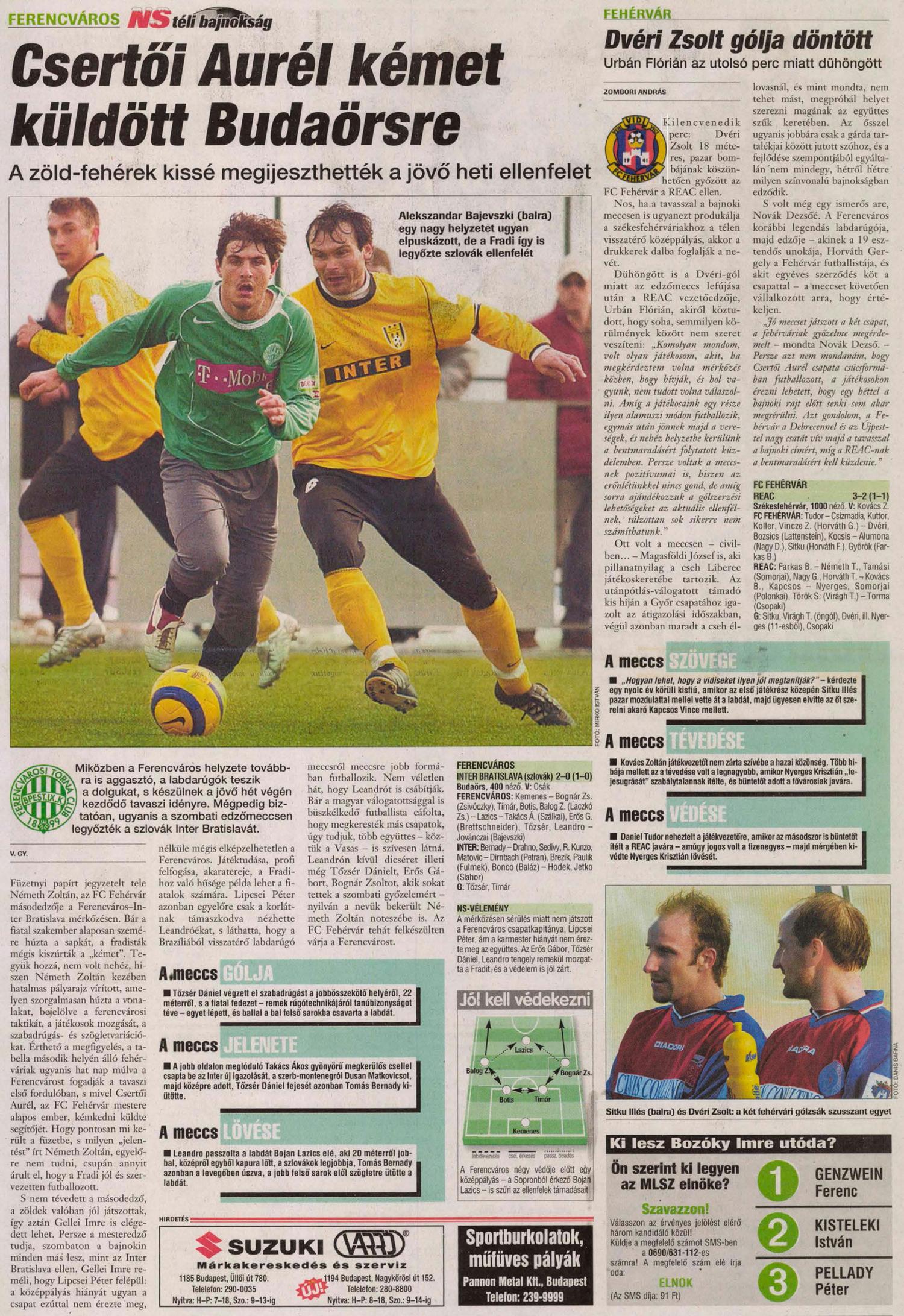 S nem tévedett a másodedző, a zöldek valóban jól játszottak, így aztán Gellei Imre is elégedett lehet. Persze a mesteredző tudja, szombaton a bajnokin minden más lesz, mint az Inter Bratislava ellen. Gellei Imre reméli, hogy Lipcsei Péter felépül: a középpályás hiányát ugyan a csapat ezúttal nem érezte meg, nélküle mégis elképzelhetetlen a Ferencváros. Játéktudása, profi felfogása, akaratereje, a Fradihoz való hűsége példa lehet a fiatalok számára. Lipcsei Péter azonban egyelőre csak a korlátnak támaszkodva nézhette Leandróékat, s láthatta, hogy a Brazíliából visszatérő labdarúgó meccsről meccsre jobb formában futballozik. Nem véletlen hát, hogy Leandrót is csábítják. Bár a magyar válogatottsággal is büszkélkedő futballista cáfolta, hogy megkeresték más csapatok, úgy tudjuk, több együttes – köztük a Vasas – is szívesen látná. Leandrón kívül dicséret illeti még Tőzsér Dánielt, Erős Gábort, Bognár Zsoltot, akik sokat tettek a szombati győzelemért – nyilván a nevük bekerült Németh Zoltán noteszébe is. Az FC Fehérvár tehát felkészülten várja a Ferencvárost.
