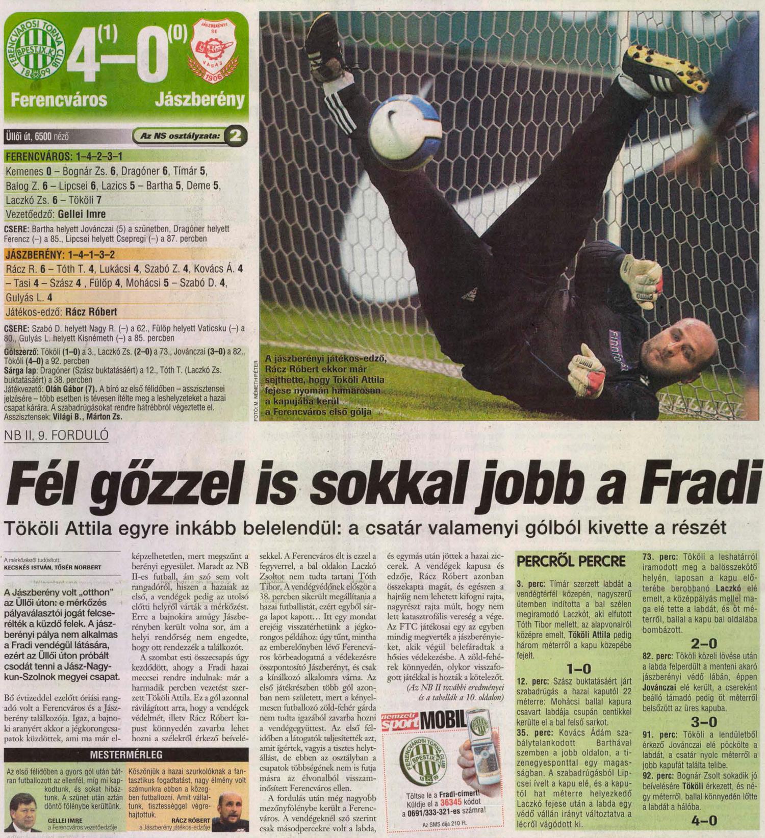 ftc.hu: Továbbra is bevehetetlen az Üllői út. Csapatunk a Jászberény ellen Tököli duplájával, Laczkó, valamint Jovánczai találataival 4-0-ás sikert aratva folytatta nagyszerű hazai szereplését. Tököli Attila valamennyi gólban szerepet vállalt, kétszer maga talált a hálóba, gólpasszt jegyzett, és a negyedik találatból is kivette a részét.