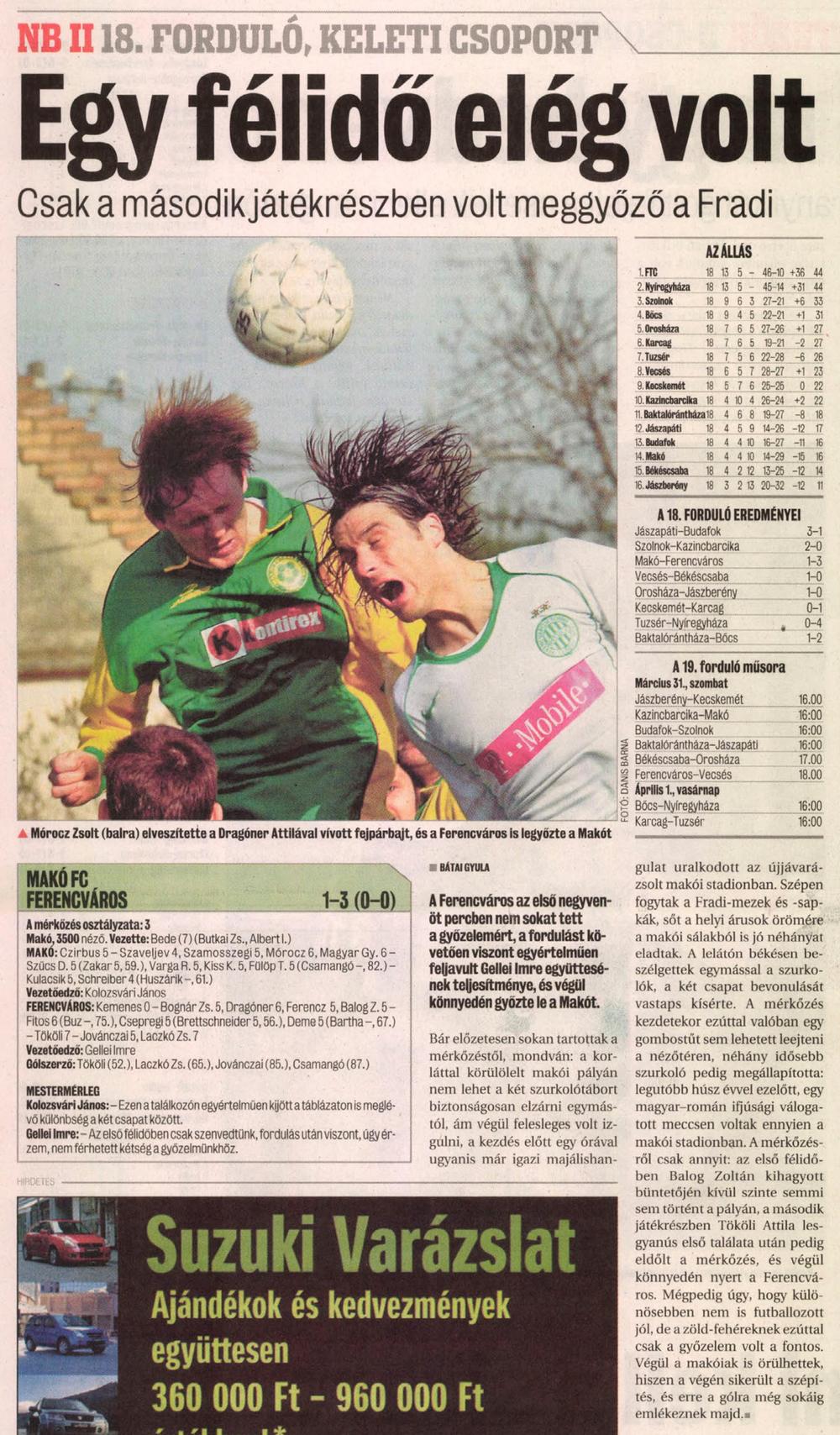 A Ferencváros a Vasastól elszenvedett hazai kupavereség után a bajnokságban idegenben javítottak. A zöld-fehérek Makón magabiztosan játszottak és megérdemelten arattak kétgólos győzelmet a másodosztályú bajnokság 18. fordulójában, a Keleti csoport alsóházába tartozó hazaiak ellen. Tököli Attila a kupaeltiltás után góllal és remek játékkal tért vissza.
