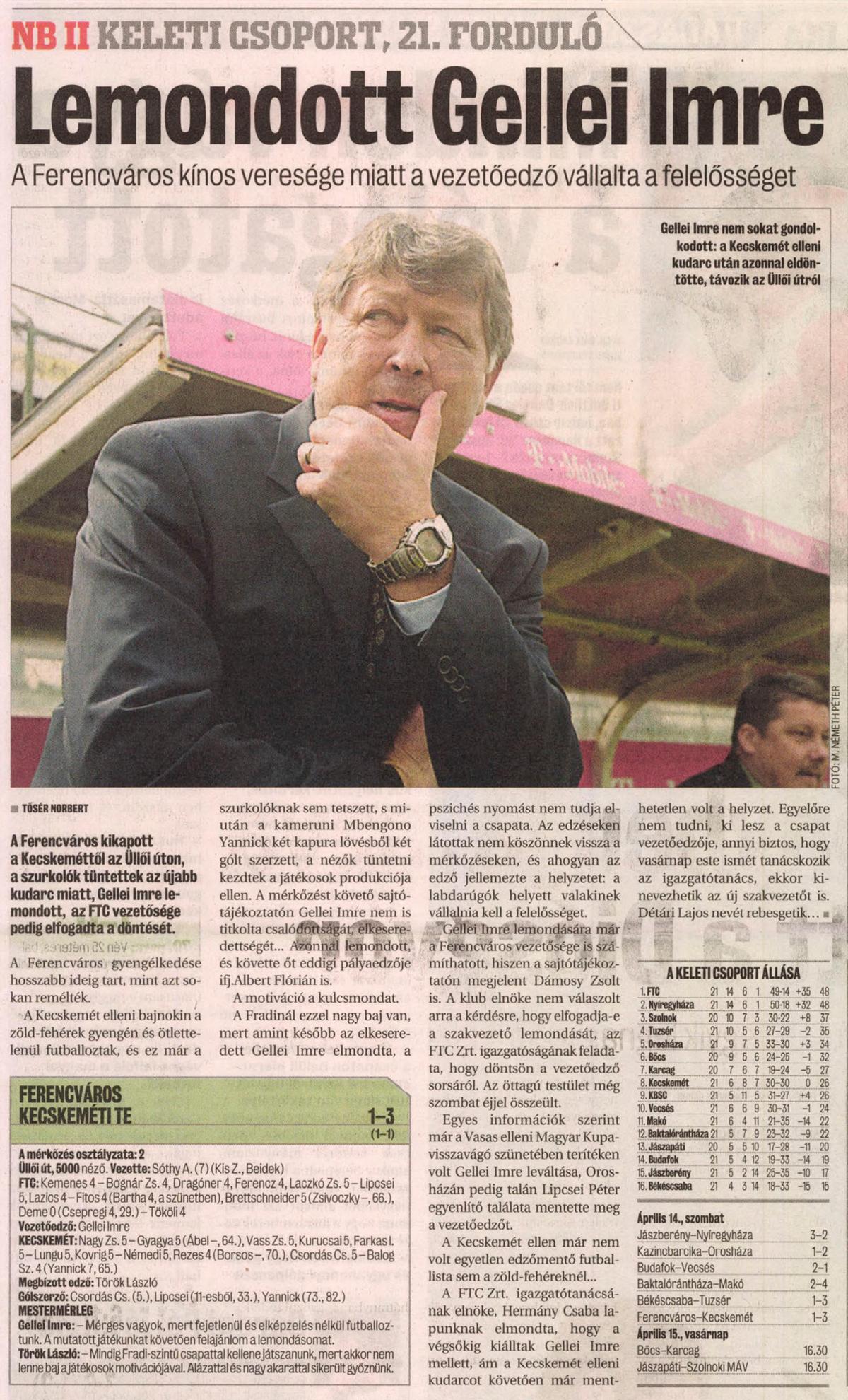 ftc.hu: A mieink 1-1-es félidő után 3-1-re kikaptak hazai pályán a Kecskeméttől. Mivel a Nyíregyháza 3-2-s vereséget szenvedett Jászberényben, továbbra is mi vagyunk az elsők.
