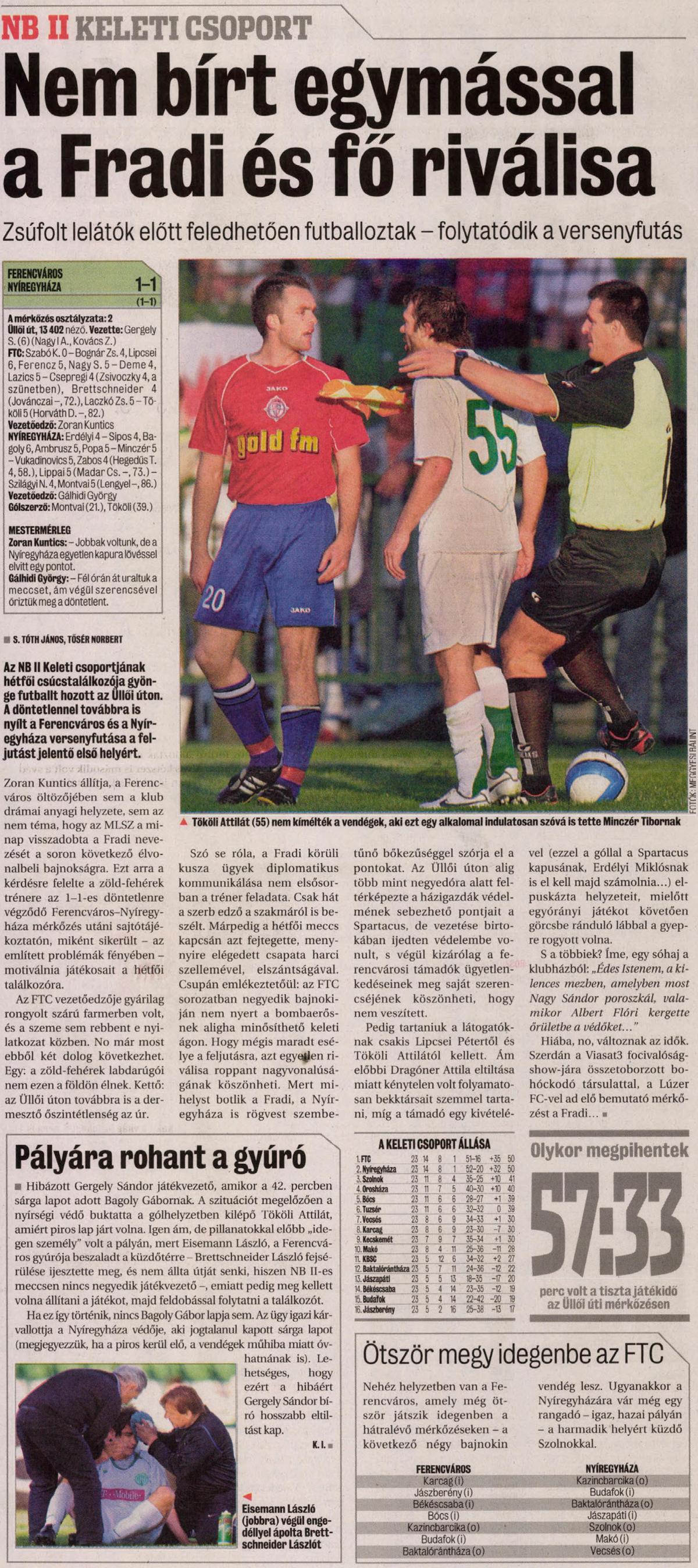 Döntetlenre végződött az NB II keleti csoportjának legnagyobb rangadója, a Ferencváros-Nyíregyháza találkozó. Az 1-1-es eredmény azt jelenti, hogy a zöld-fehérek továbbra is csak jobb gólkülönbségüknek köszönhetően előzik meg üldözőjüket. A két gól Montvai Tibor és Tököli Attila nevéhez fűződik.