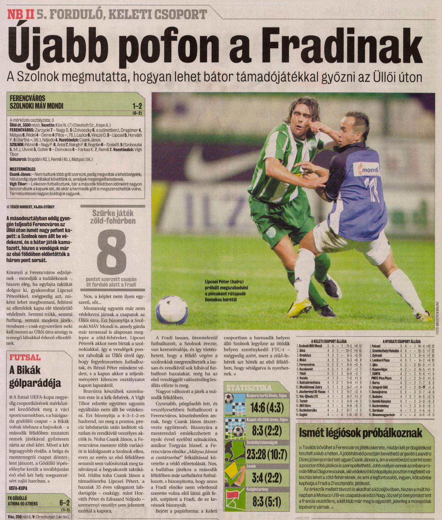 ftc.hu: Labdarúgócsapatunk 2-1-es vereséget szenvedett az Üllői úton a Szolnoktól. Az első félidei rövidzárlat a veretlenségünkbe került, hiszen rövid idő alatt két gólt kaptunk. Fordulás után hatalmas fölényben játszottunk, de Mátyus gólja csak a szépítéshez volt elegendő, a folytatásban pedig hiába voltak nagy helyzeteink, nem sikerült betalálni.