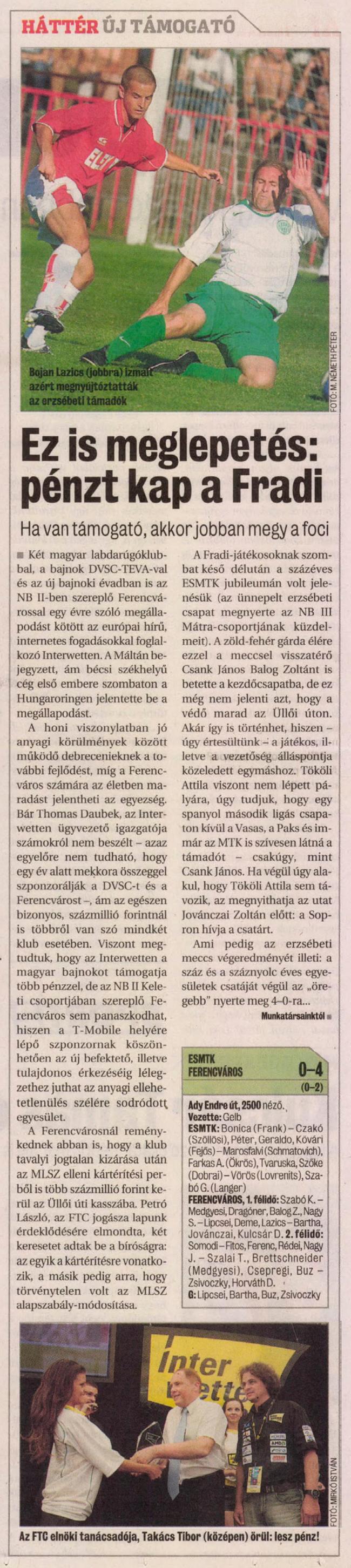 A Ferencvárosi TC labdarúgócsapata kiütéses, 4-0-s győzelmet aratott az ESMTK otthonában 2500 néző előtt az Ady Endre úton. A zöld-fehérek góljait sorrendben Lipcsei, Bartha, Buz, és Zsivóczky szerezte.