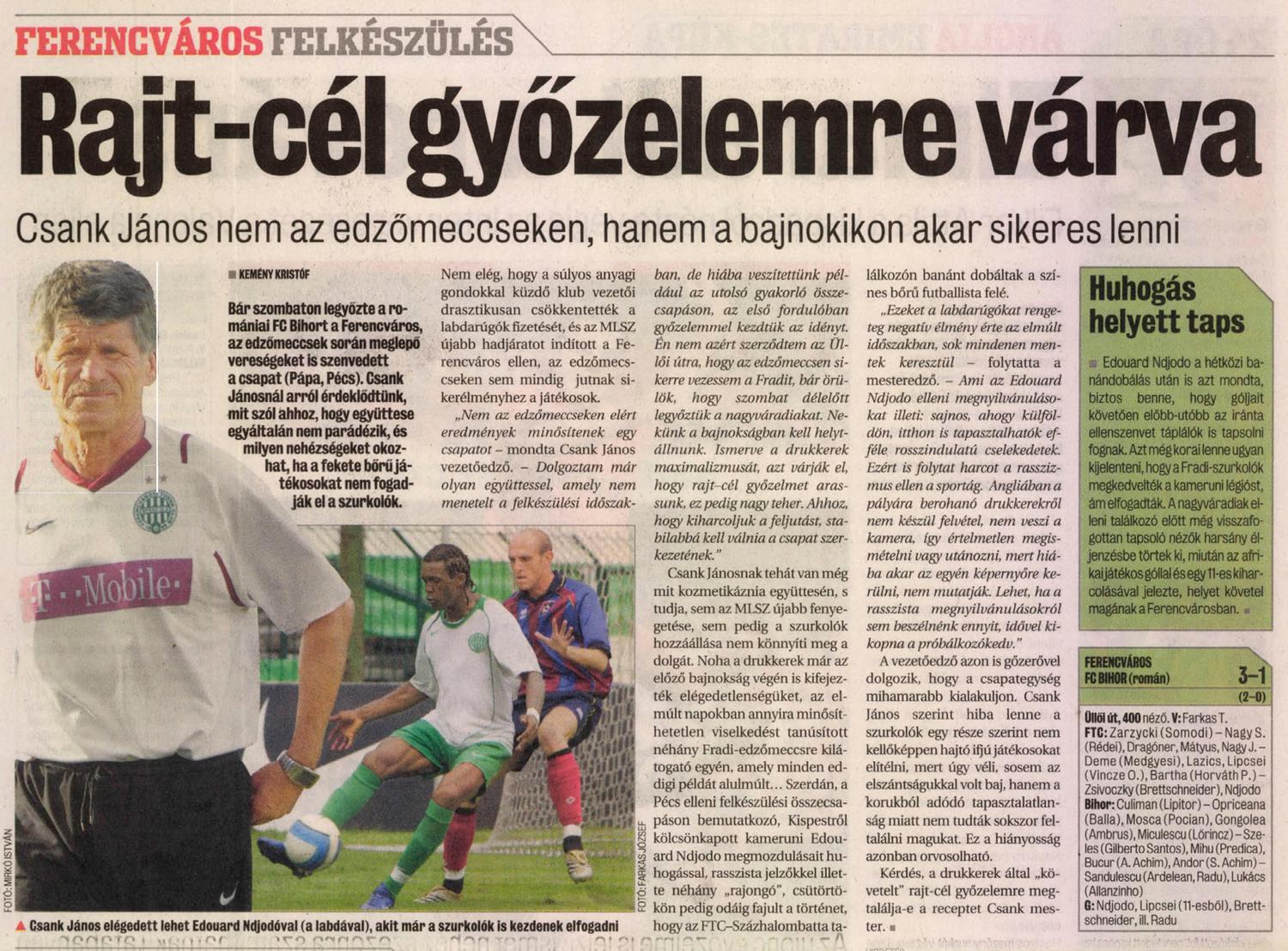 ftc.hu: Edzőmeccsen kétgólos félidei előny után 3-1-re vertük a nagyváradi FC Bihort. Csapatunk nemcsak eredményesen, hanem jól is játszott, főleg az első félidőben. Góljainkat Ndjodo, Lipcsei és Brettschneider szerezte.