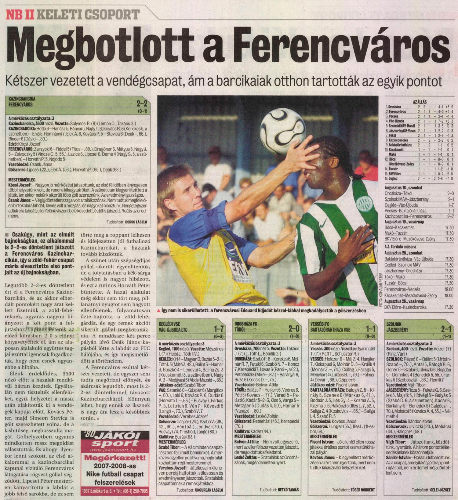 A tavalyi mérkőzéshez hasonlóan 2-2-es eredmény született a labdarúgó magyar-bajnokság másodosztályában a Frencváros kazincbarcikai vendégjátékán. A második forduló legnagyobb érdeklődéssel várt találkozóján a Fradi előbb Lipcsei Péter, majd Horváth Péter révén szerezte meg a vezetést. A hazaiak azonban mindkétszer egyenlíteni tudtak: a Barcikában Elek Ákos és Deák János volt eredményes.
