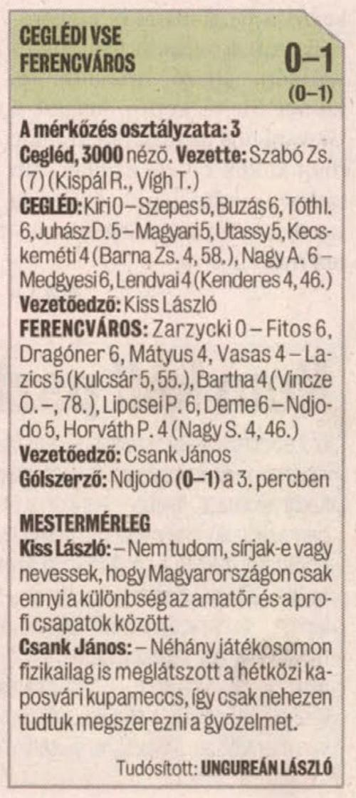 Kiss László (a Cegléd vezetőedzője): – Ez a meccs a játékvezetőkön múlt. Szerintem nem volt jobb a Fradi nálunk.