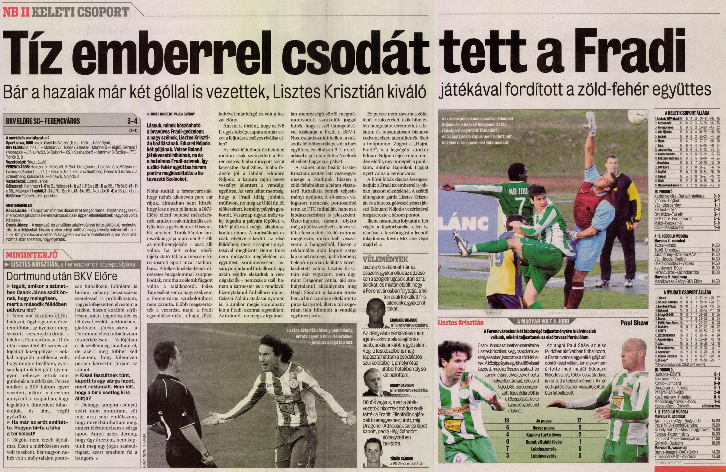 ftc.hu: Fordulatos meccsen győztünk 4-3-ra a BKV otthonában. A mieink már kétgólos hátrányban is voltak, sőt fordítani tíz emberrel sikerült. Góljainkat Ndjodo (2), Mátyus és Bartha szerezték. Csapatunk így egy pontra megközelítette a Kecskemétet, amely Makón kapott ki 3-0-ra.
