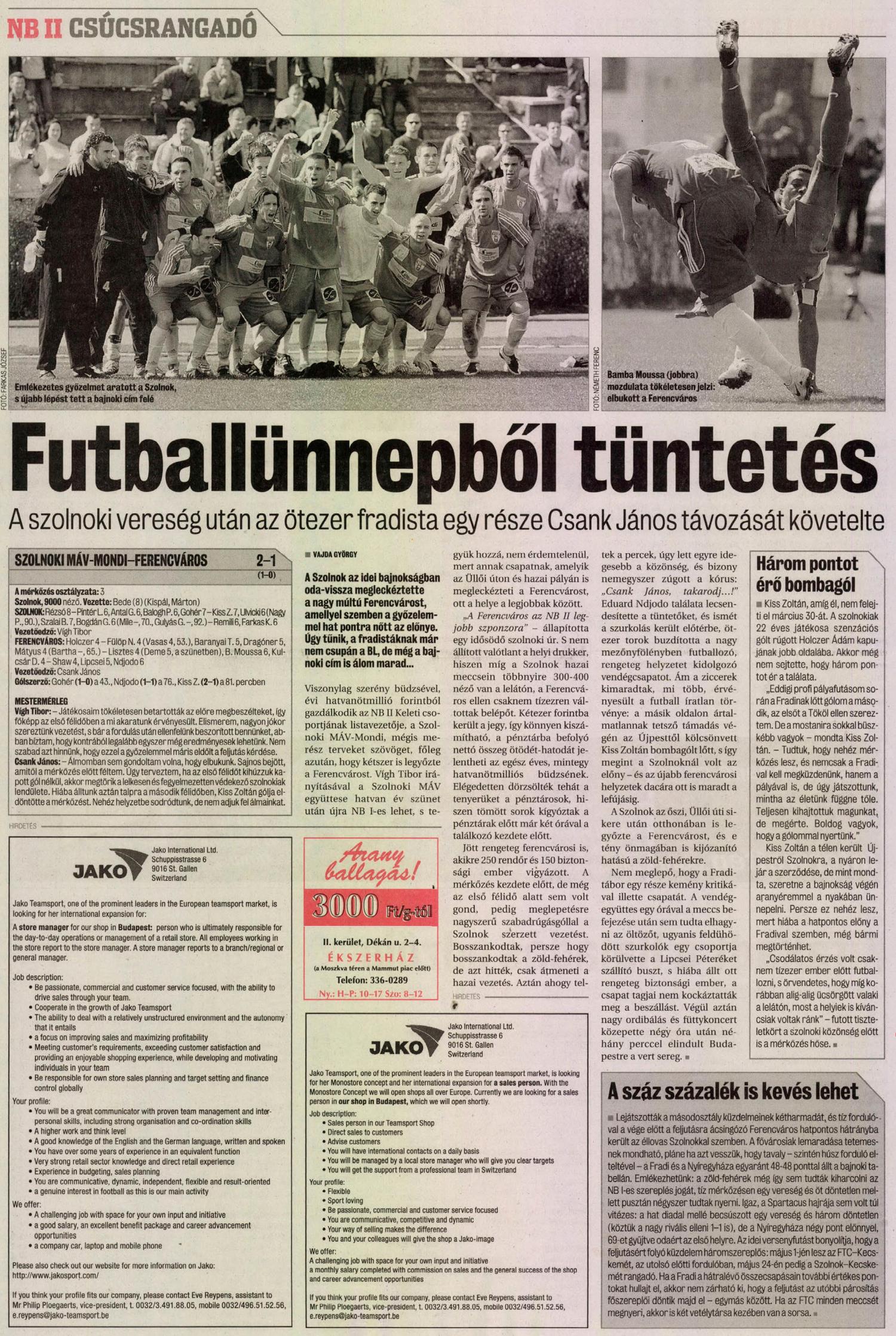 Szolnok – Tiszaligeti stadion, 7.000 néző, vezette: Bede Ferenc (Kispál, Márton)